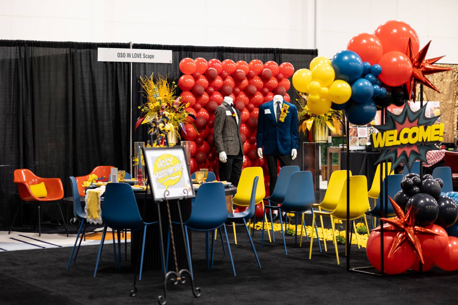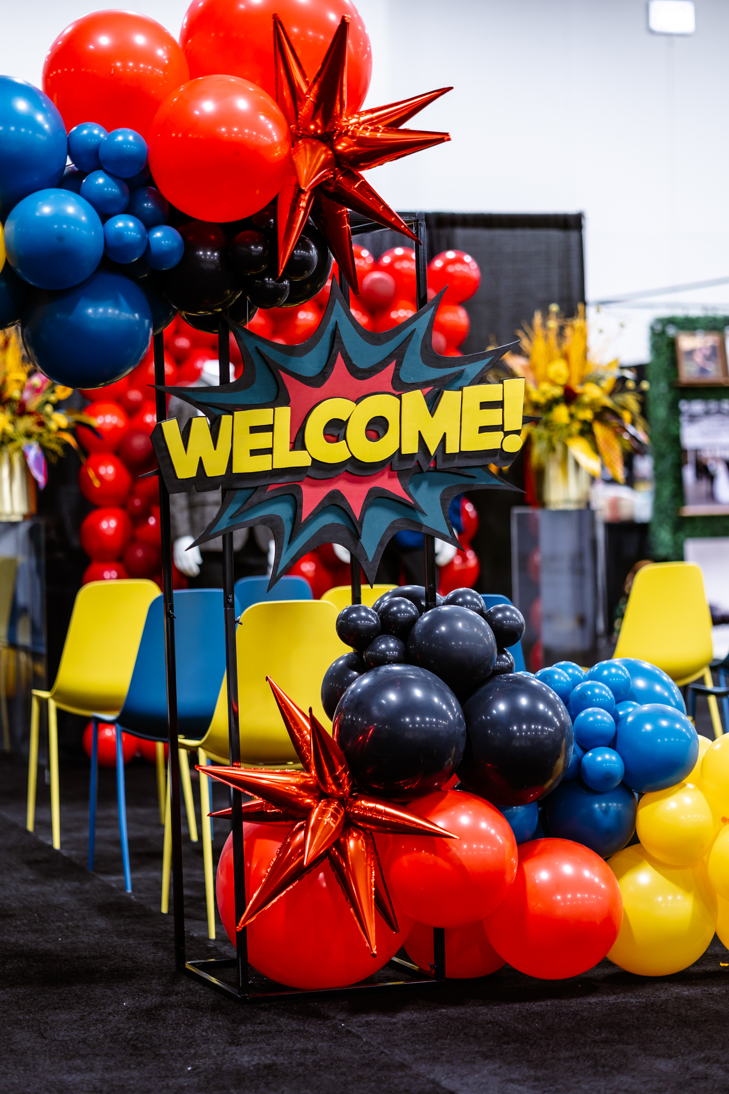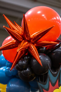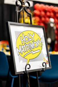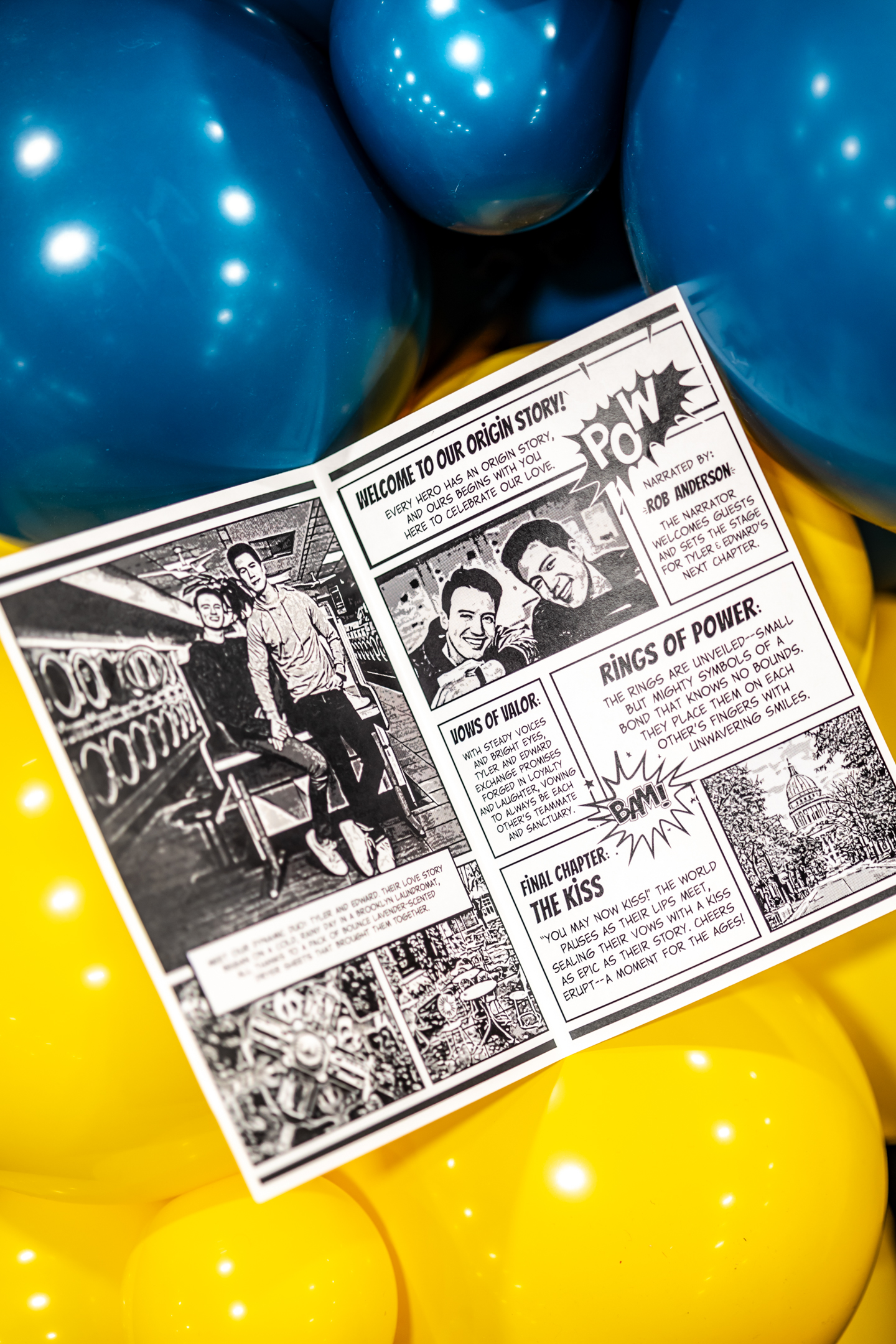 Bold, bright, and action-packed, OSO IN LOVE coordinated this “Holy Matrimony Scape” inspired by the colorful and dynamic world of comic books and superheroes. With a vibrant color scheme of red, blue, yellow, black, and white, the design began with a contour-cut welcome sign and balloon arrangements by Daydream Design that included starburst metallic accents.