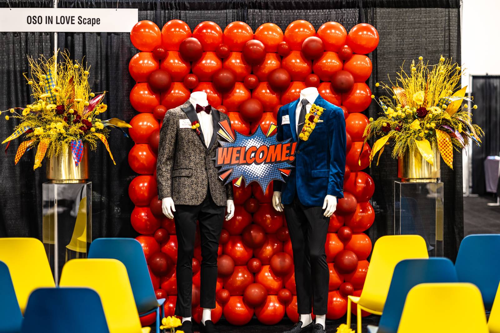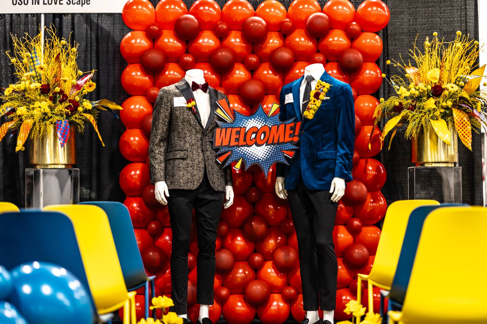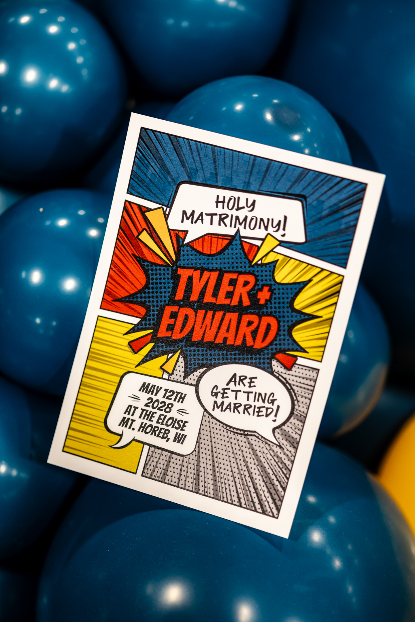Bold, bright, and action-packed, OSO IN LOVE coordinated this “Holy Matrimony Scape” inspired by the colorful and dynamic world of comic books and superheroes. With a vibrant color scheme of red, blue, yellow, black, and white, the design began with a contour-cut welcome sign and balloon arrangements by Daydream Design that included starburst metallic accents.