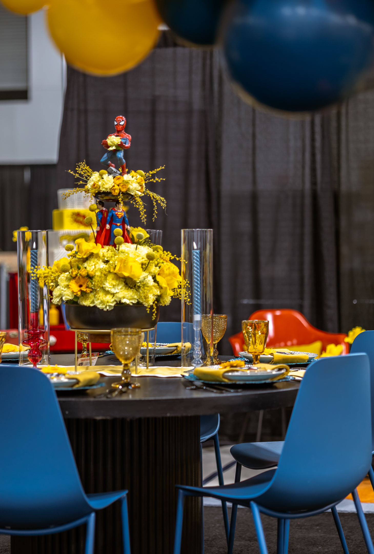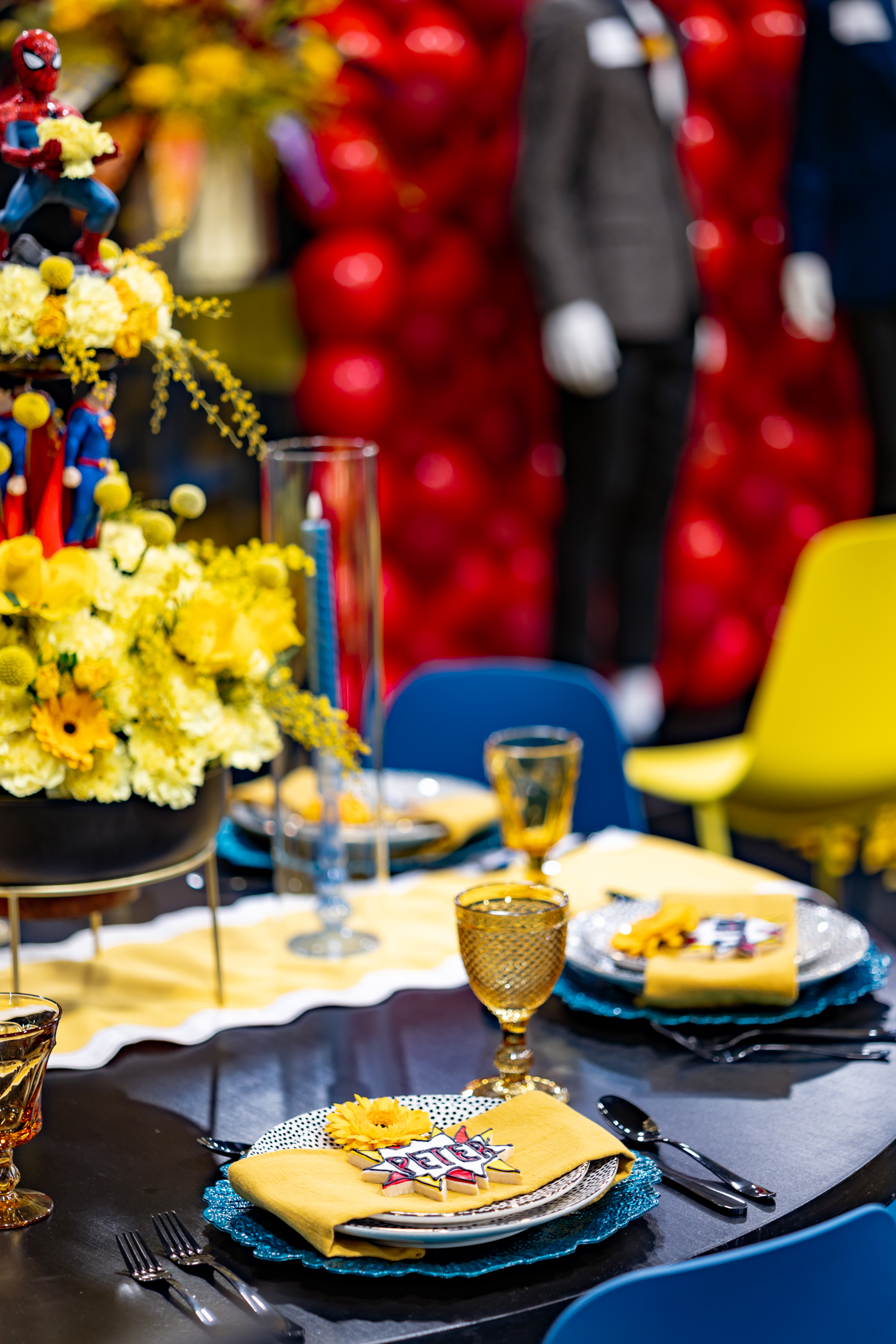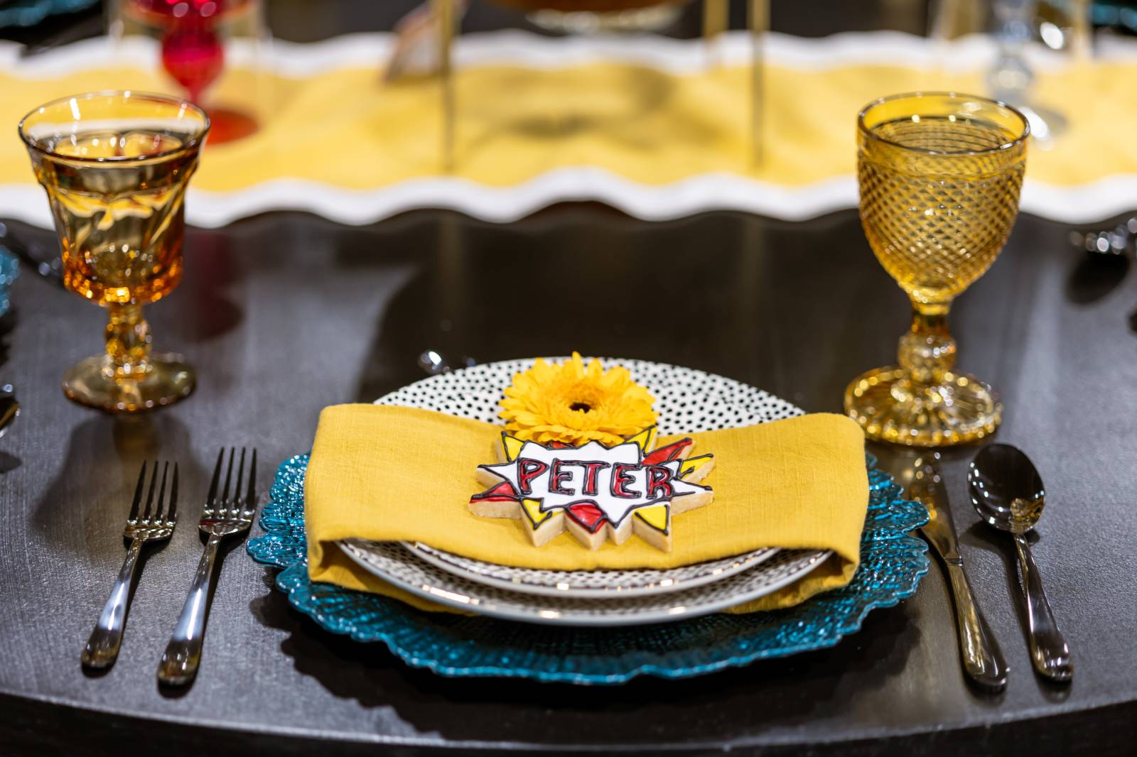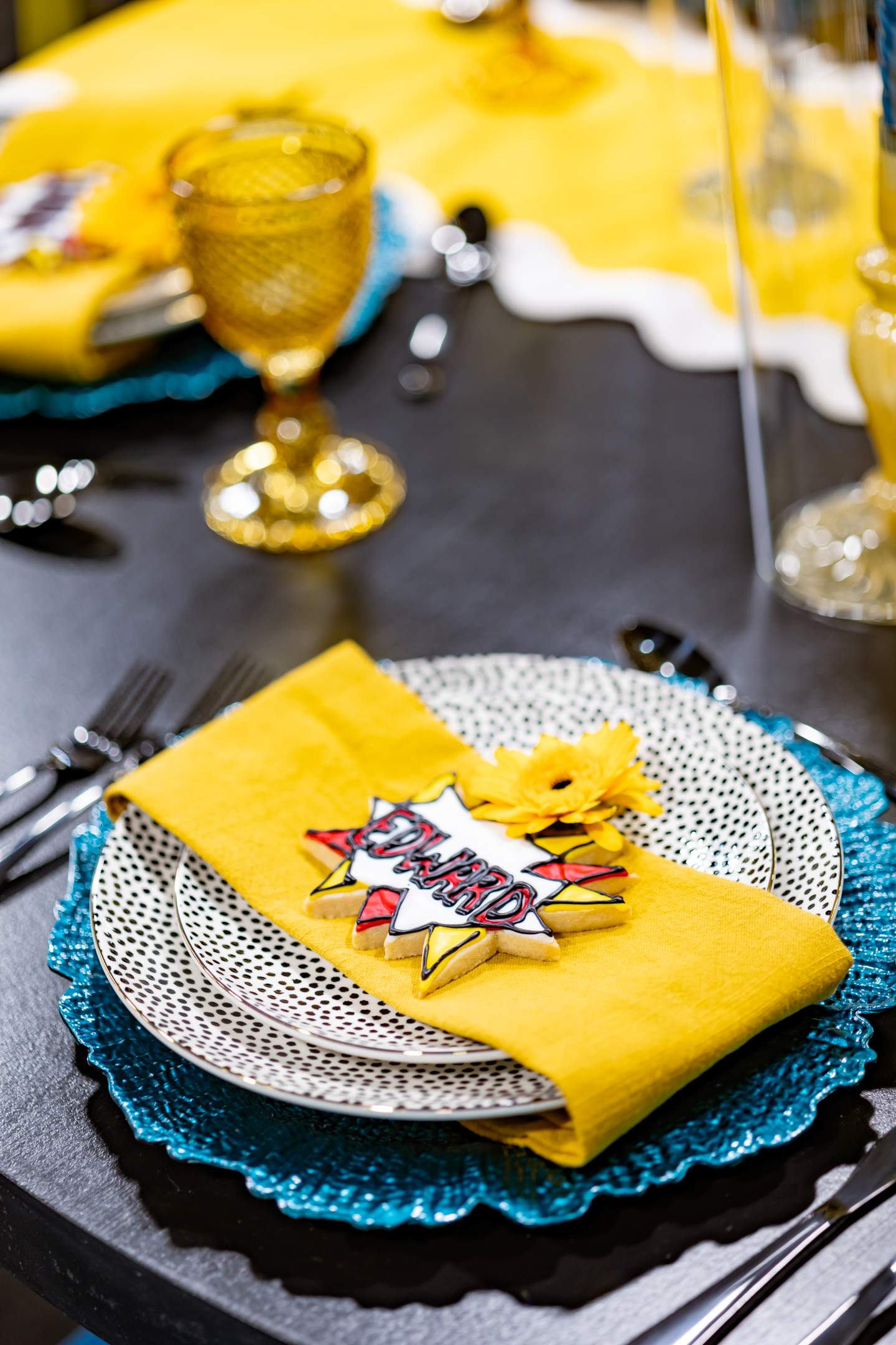 The tablescape featured a fluted black round table from Velvet Rentals paired with blue chairs and vibrant pops of color through blue twist candles, yellow napkins, and a bold yellow floral centerpiece by Cosmic Gardens, complete with superhero figurines. A playful mix of tableware included blue chargers and polka dot plates. Starburst name card cookies by Sandy Kakes sat upon them, with guests’ names in bold comic-style fonts.