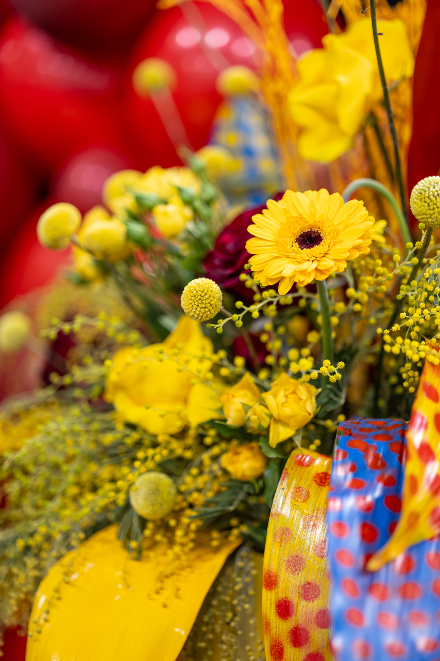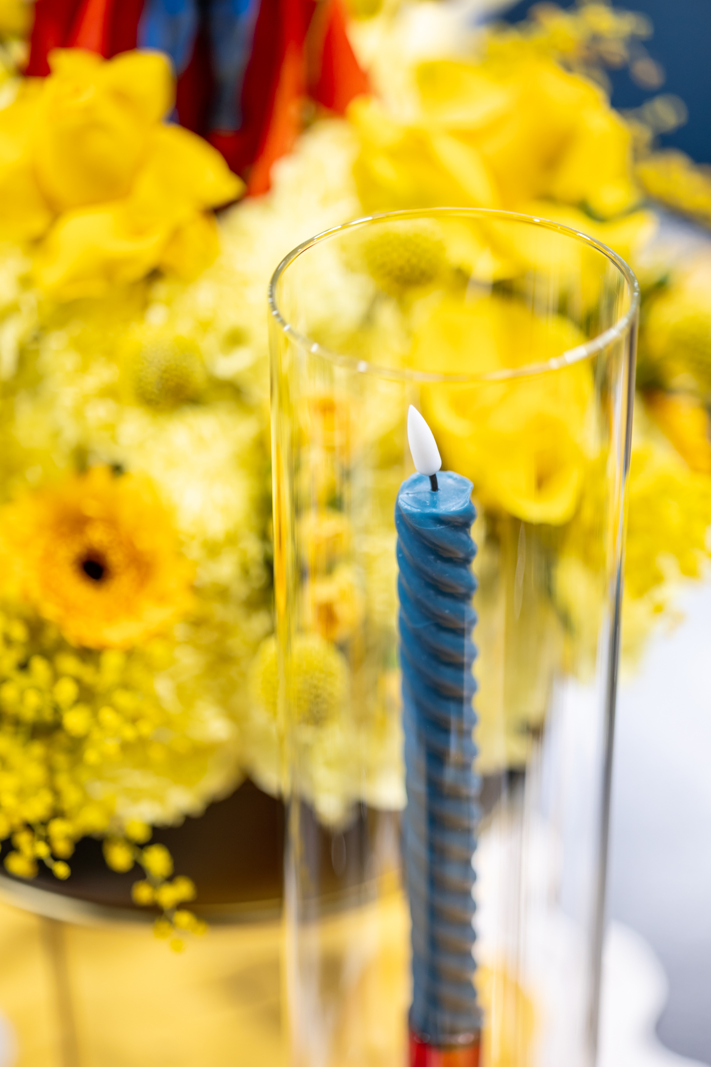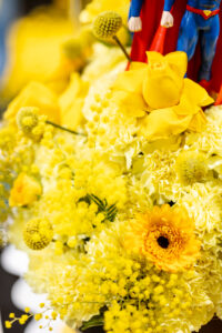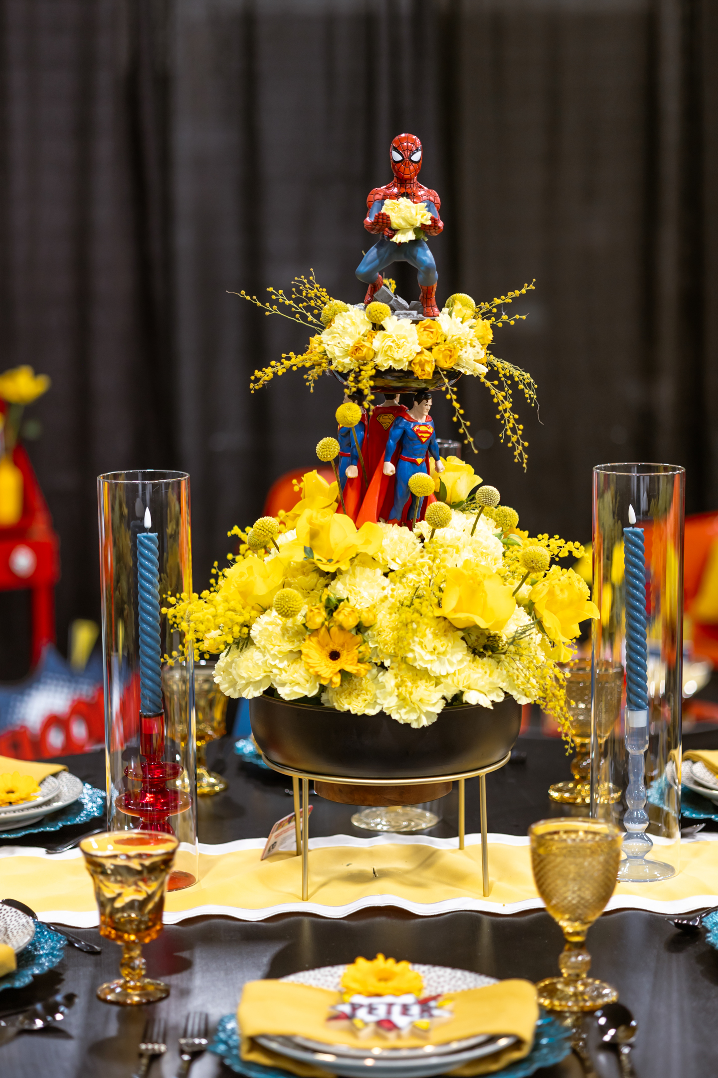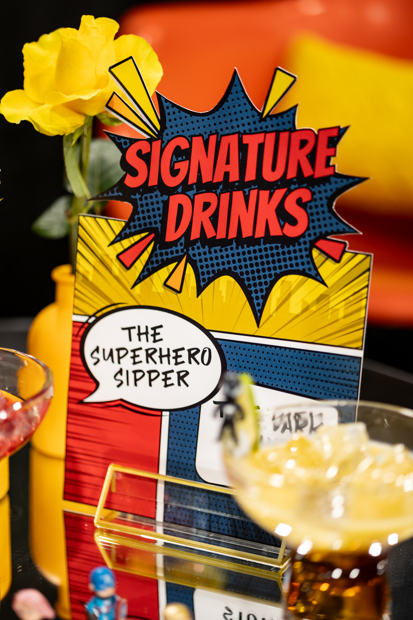 The tablescape featured a fluted black round table from Velvet Rentals paired with blue chairs and vibrant pops of color through blue twist candles, yellow napkins, and a bold yellow floral centerpiece by Cosmic Gardens, complete with superhero figurines. A playful mix of tableware included blue chargers and polka dot plates. Starburst name card cookies by Sandy Kakes sat upon them, with guests’ names in bold comic-style fonts.