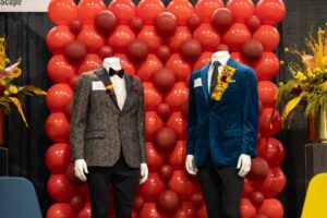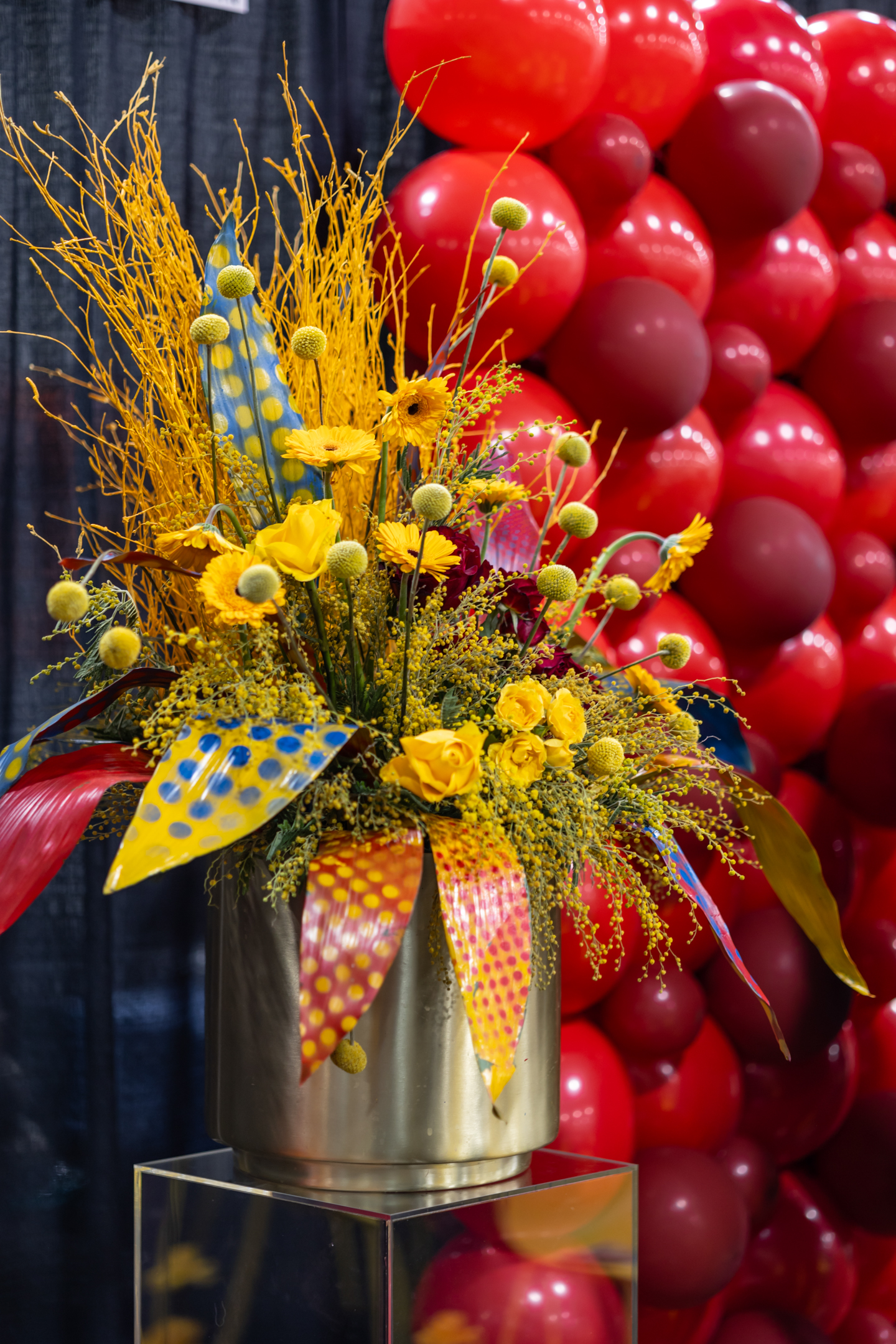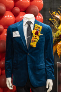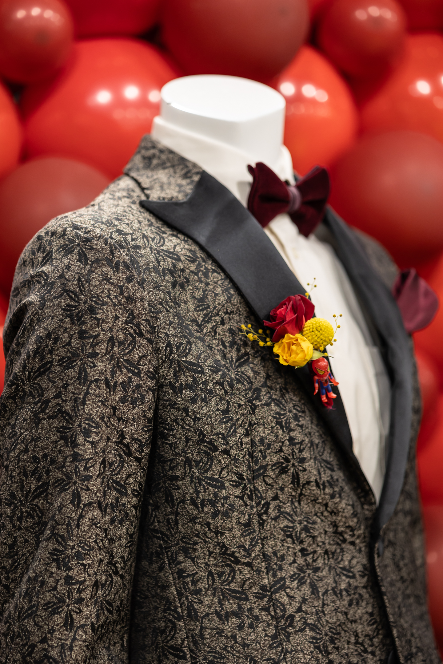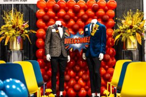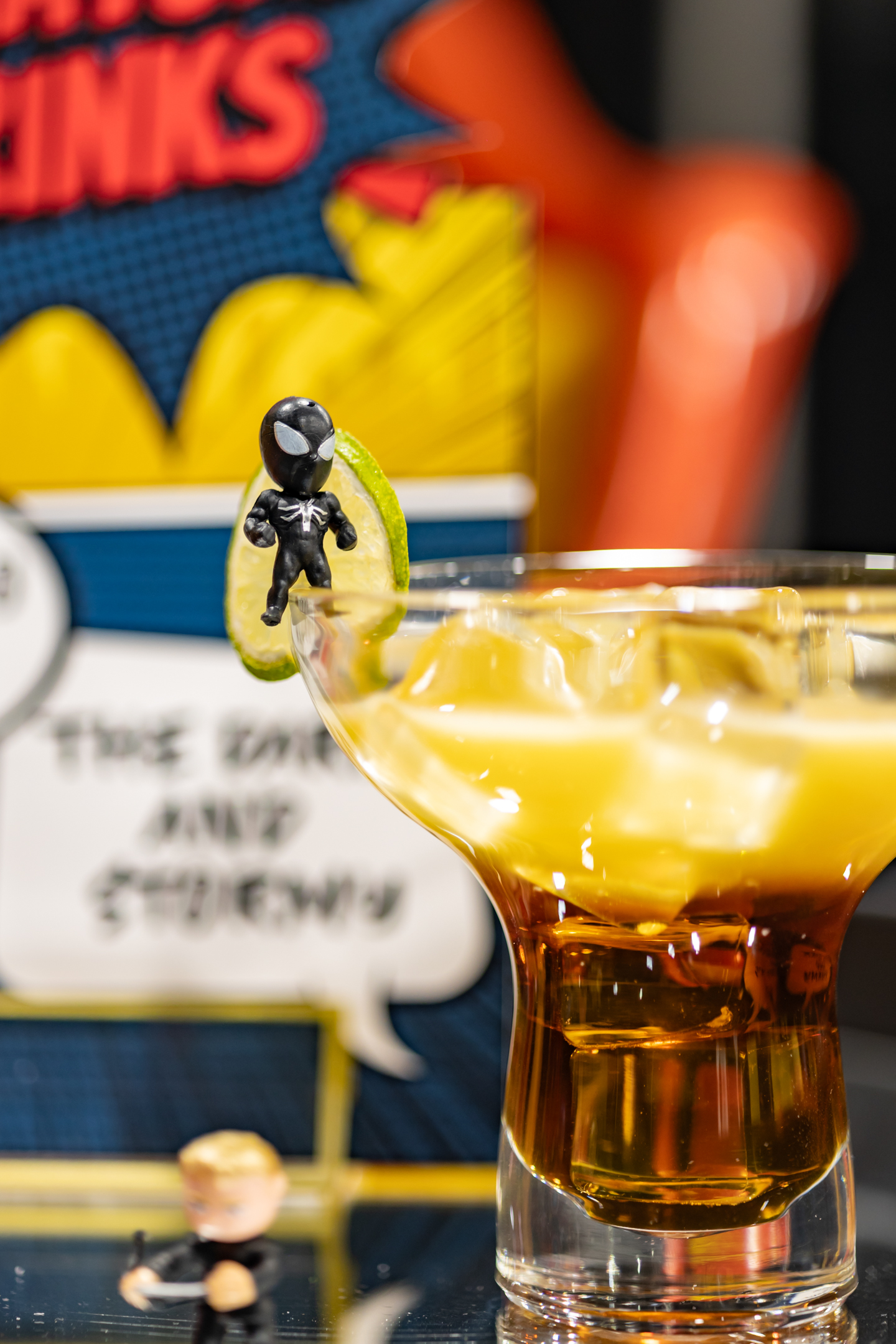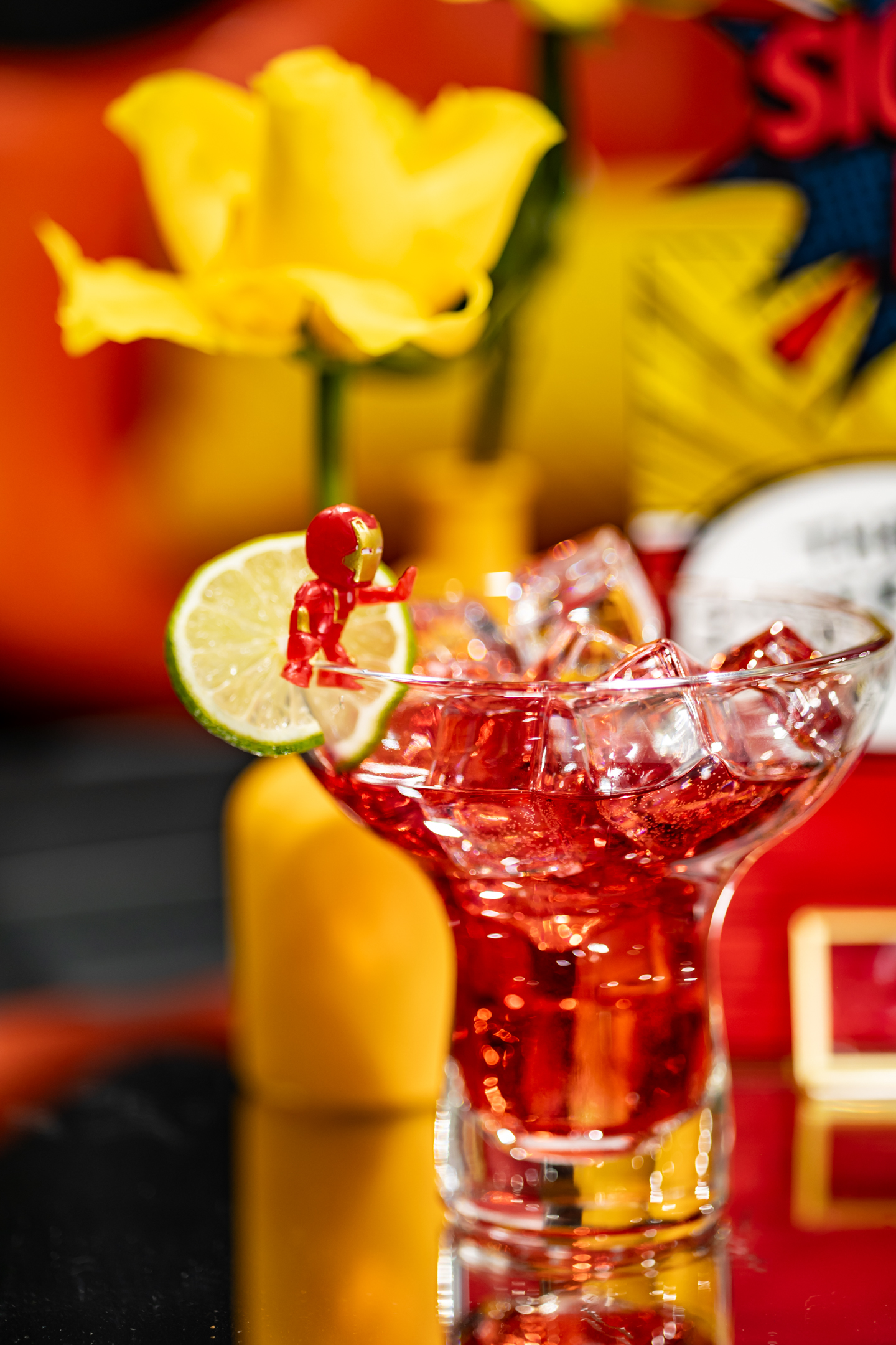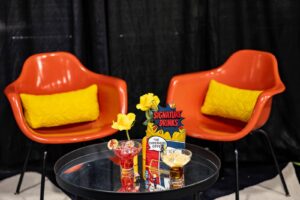 The lounge area was a playful and stylish nod to bold design and personality. Red chairs with vibrant yellow pillows surrounded a round glass table centerpiece from Velvet Rentals featuring a contour-cut drink menu and nostalgic superhero figurines.