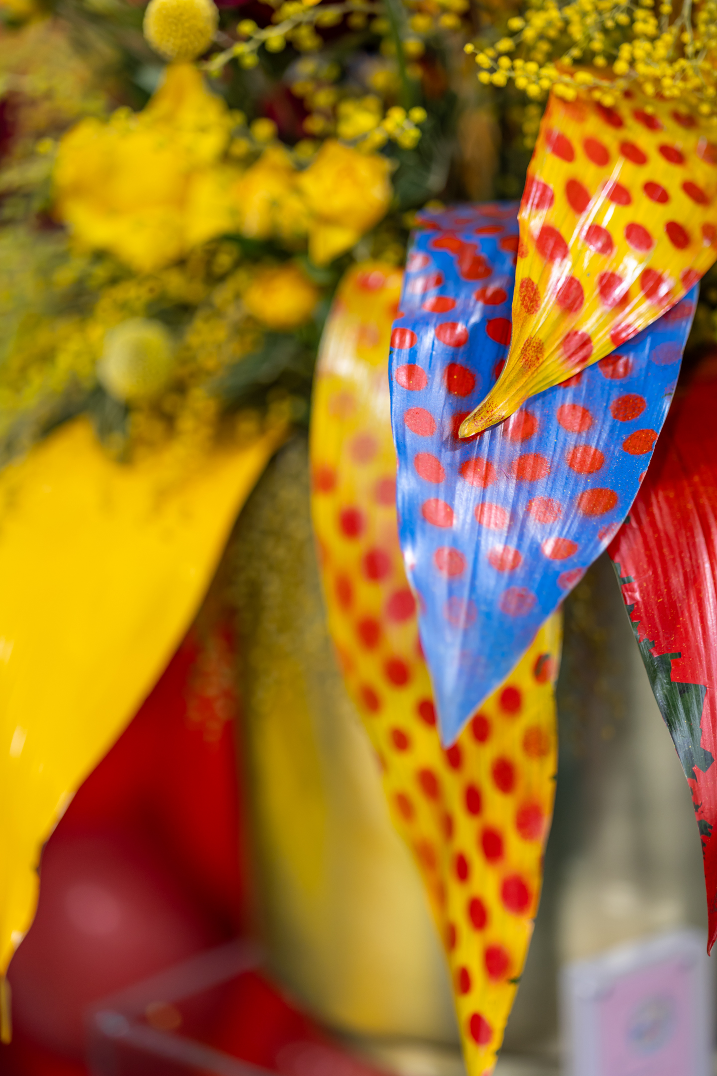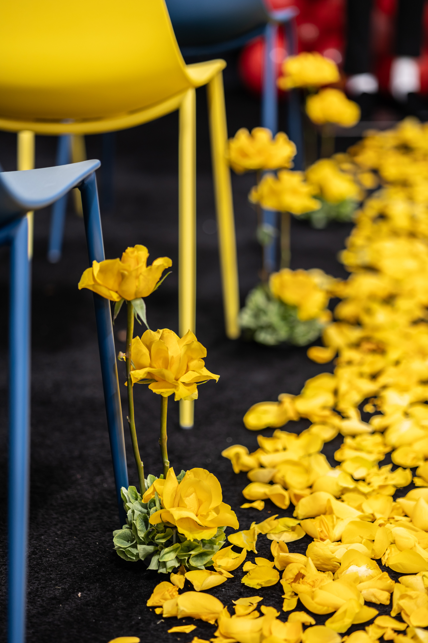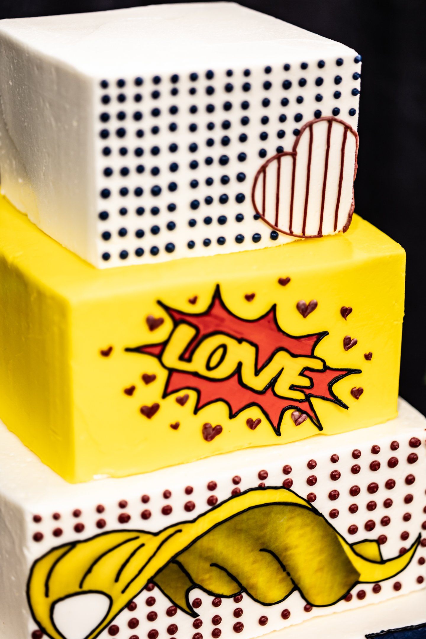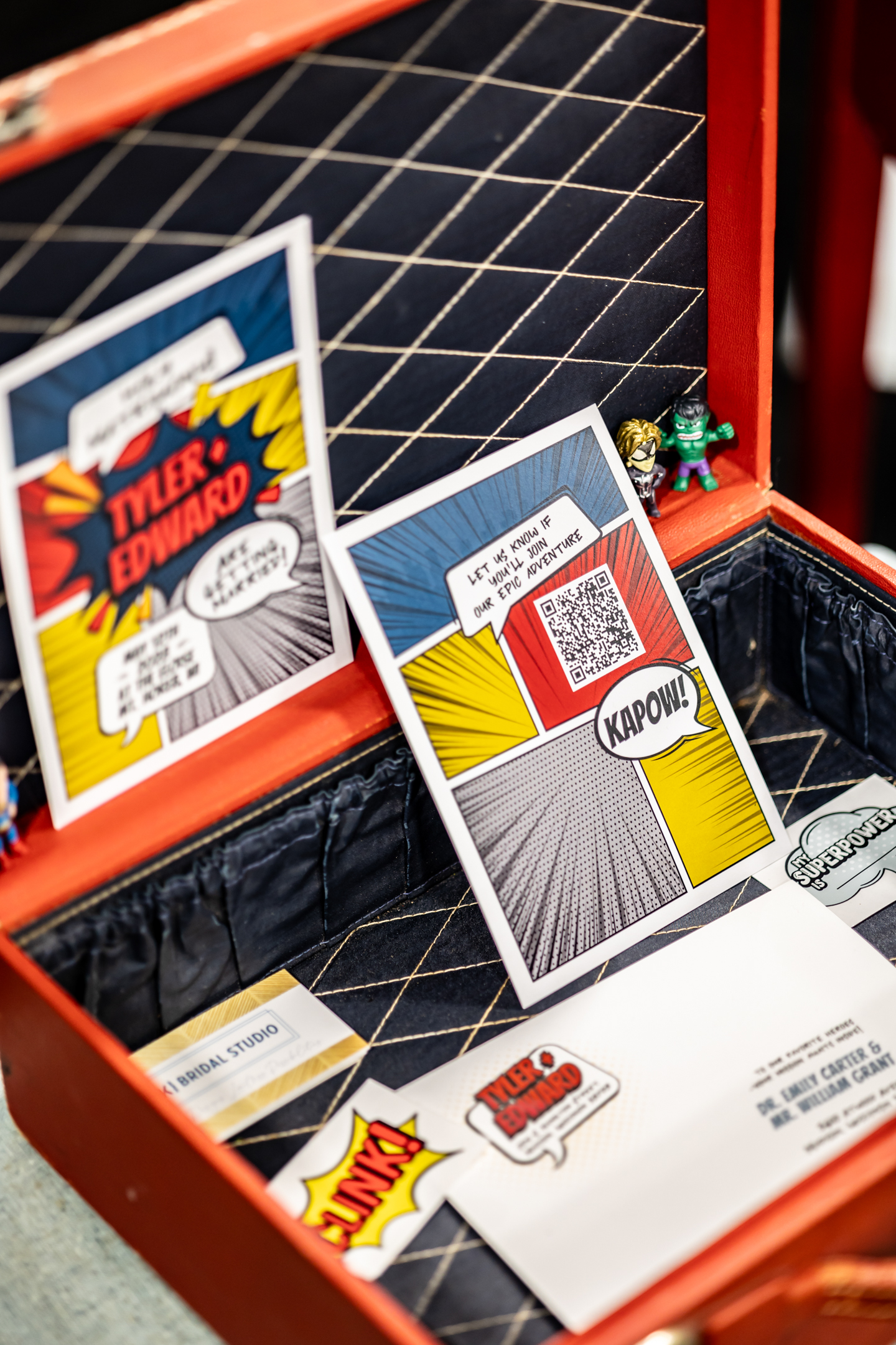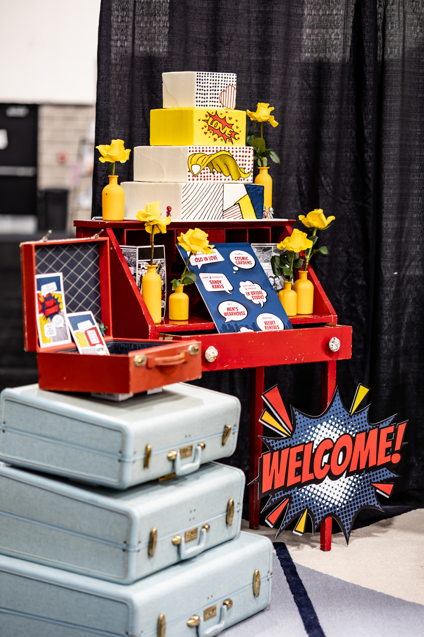The dessert table was equally lively, featuring a bright red desk and stacked blue and red suitcases showcasing comic book-themed stationery by LK Bridal Studio. The cake, a four-tiered square creation, was decorated with comic motifs, while yellow bud vases and quirky printed pieces, such as a comic book-style invitation and storytelling day-of program, added unique touches.