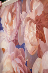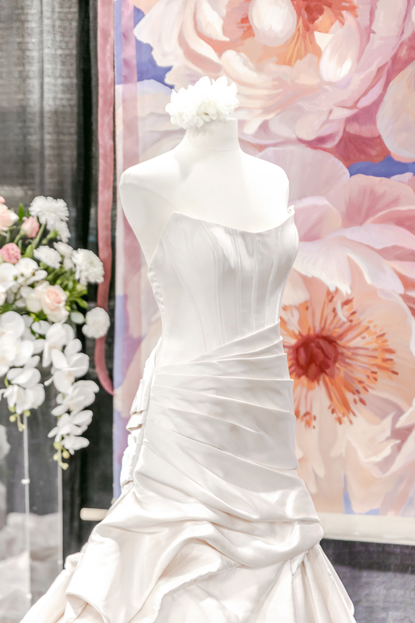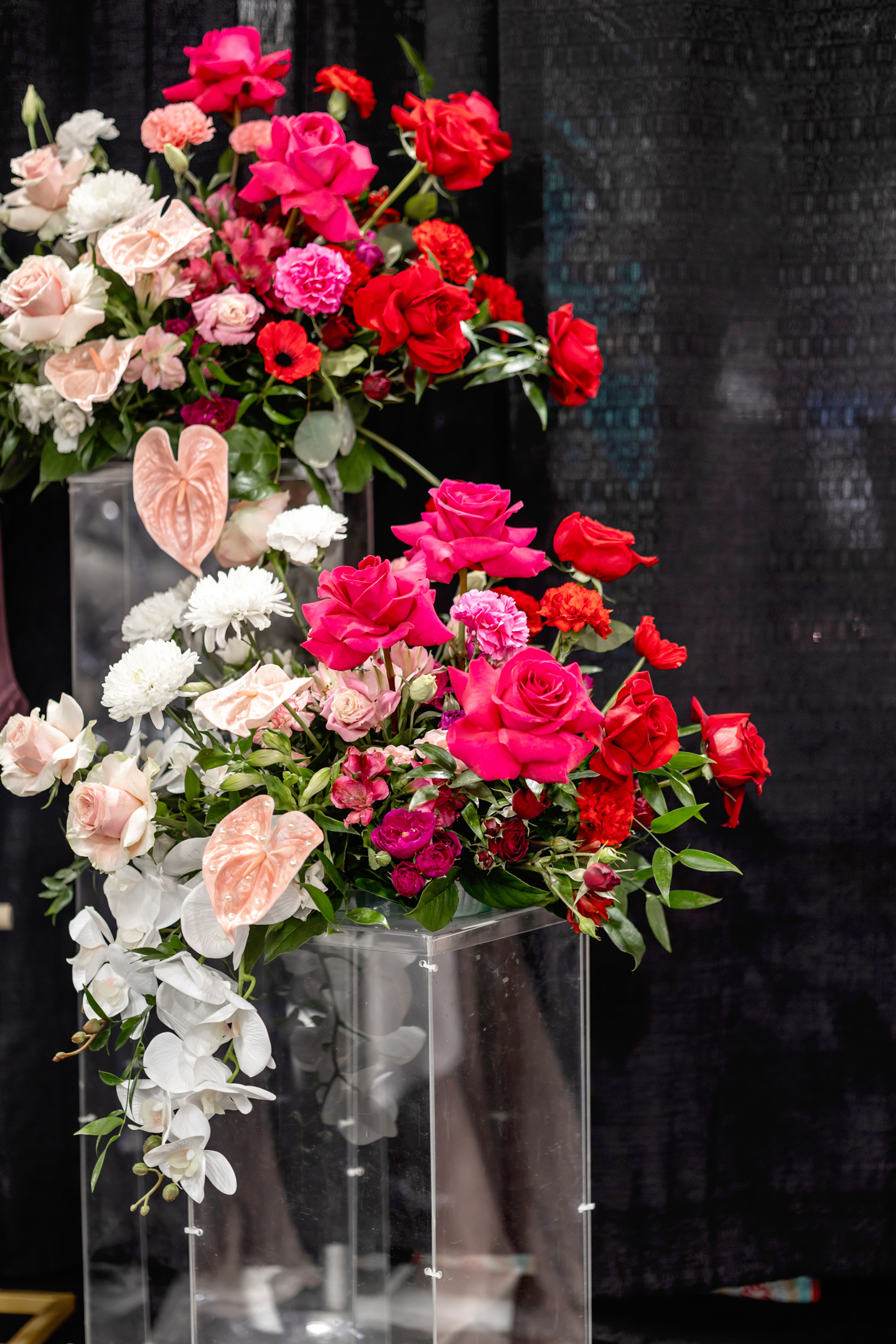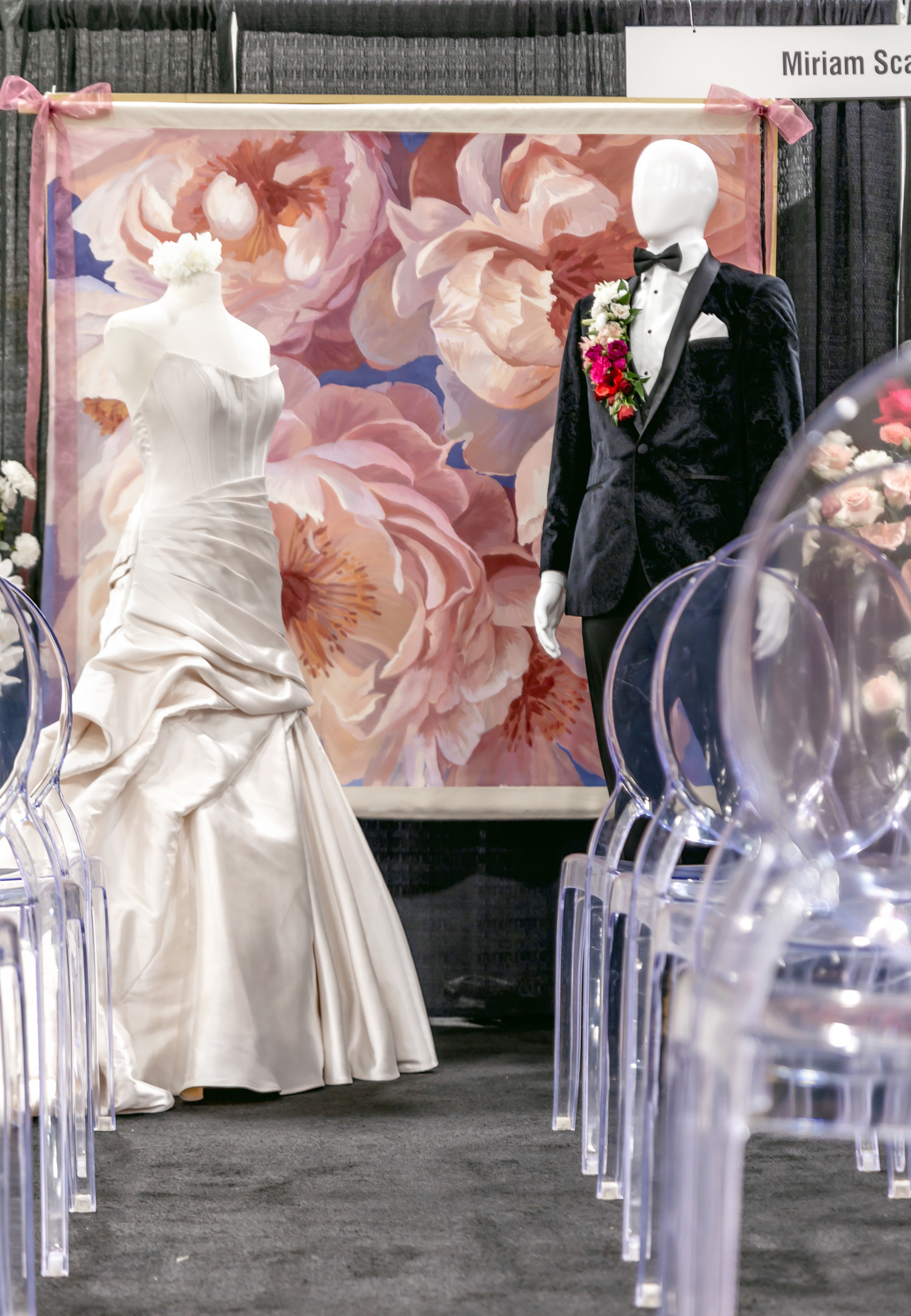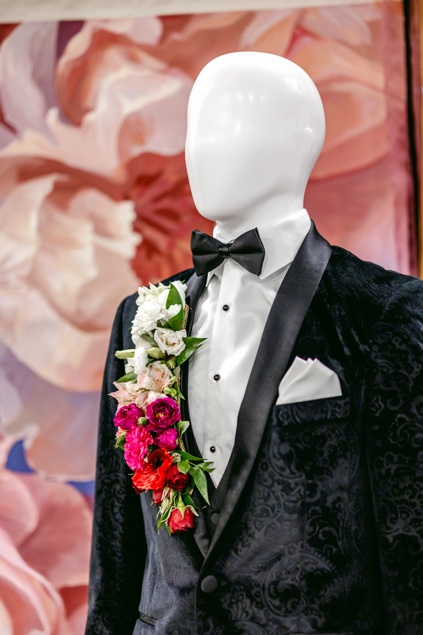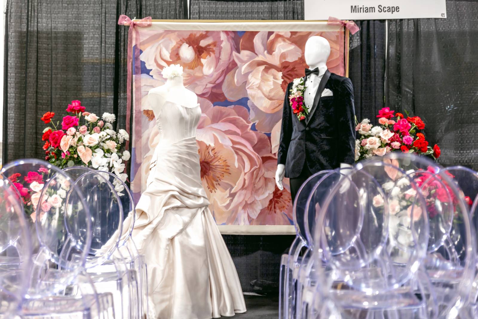 At the ceremony, clear acrylic chairs from Event Essentials and a painted floral backdrop from Castle Walls Wedding paired modern with organic. Framed by acrylic columns topped with vibrant blooms, the bride and groom were elegantly dressed in a structured corset bodice dress with a voluminous, textured skirt from Vera’s House of Bridals, and a sharp black suit from DuBois Formalwear with a floral boutonniere, respectively.