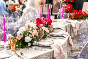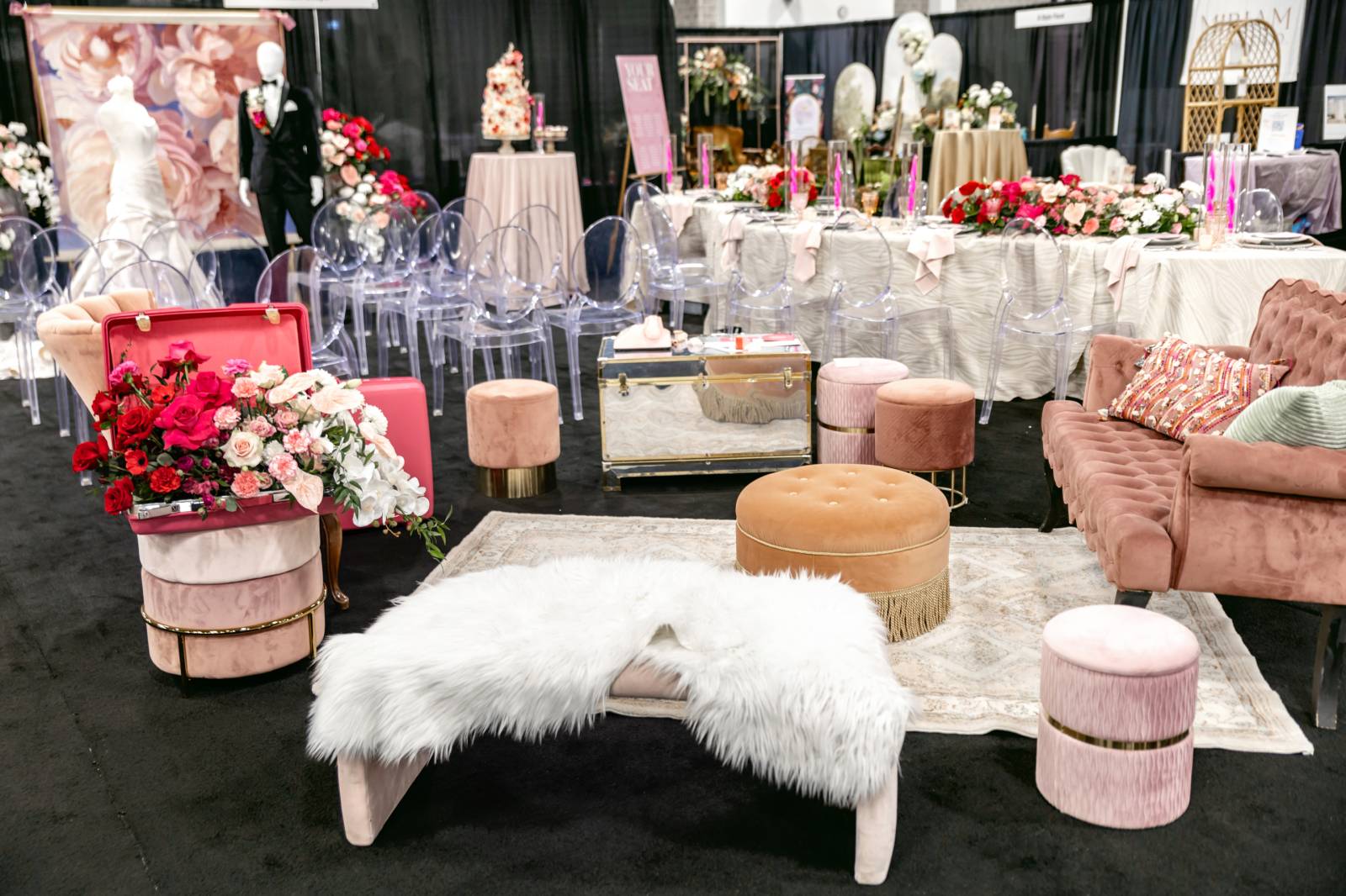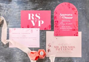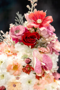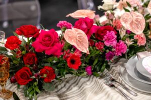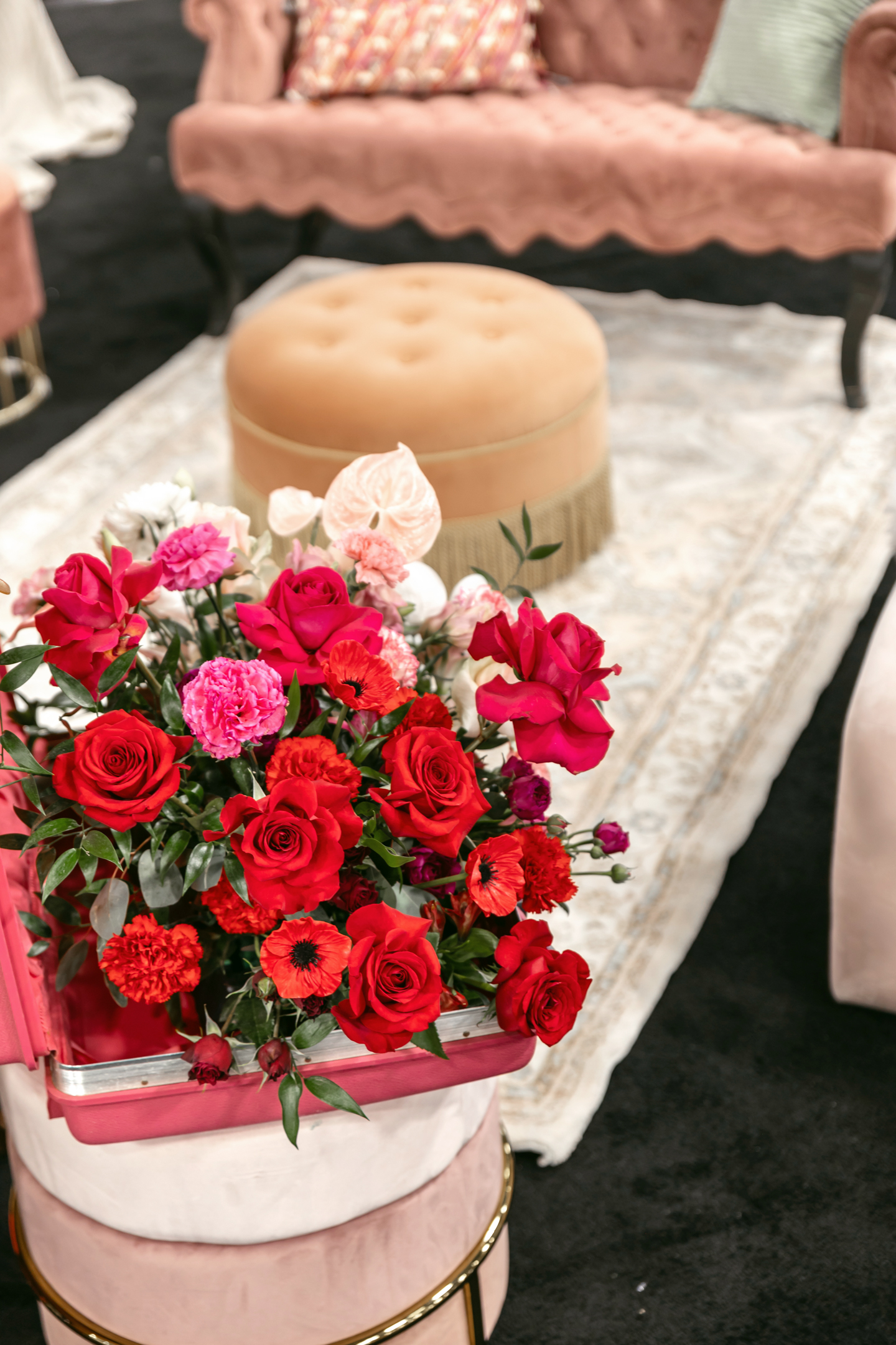 Coordinated Miriam Events Co., the bold, romantic, and chic “Pink Dreamscape” brought together vibrant hues, luxurious textures, and modern details for a stunning wedding design. Lush floral arrangements by B-Style Floral in red, pink, and white set the tone in every space. The lounge area featured velvet furniture from Velvet Rentals in shades of pink and peach, a vintage audio guest book, and playful hot pink suitcases.