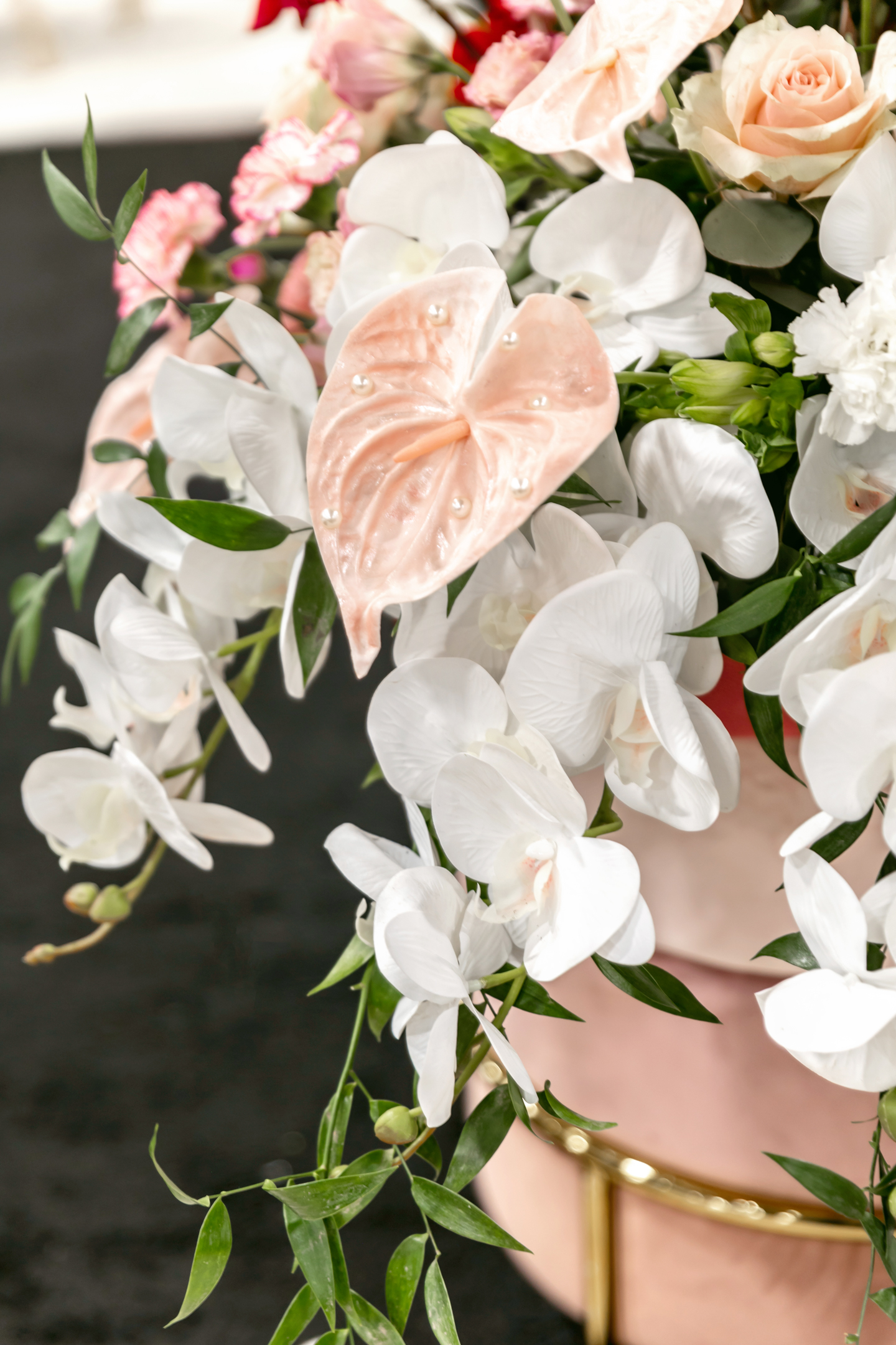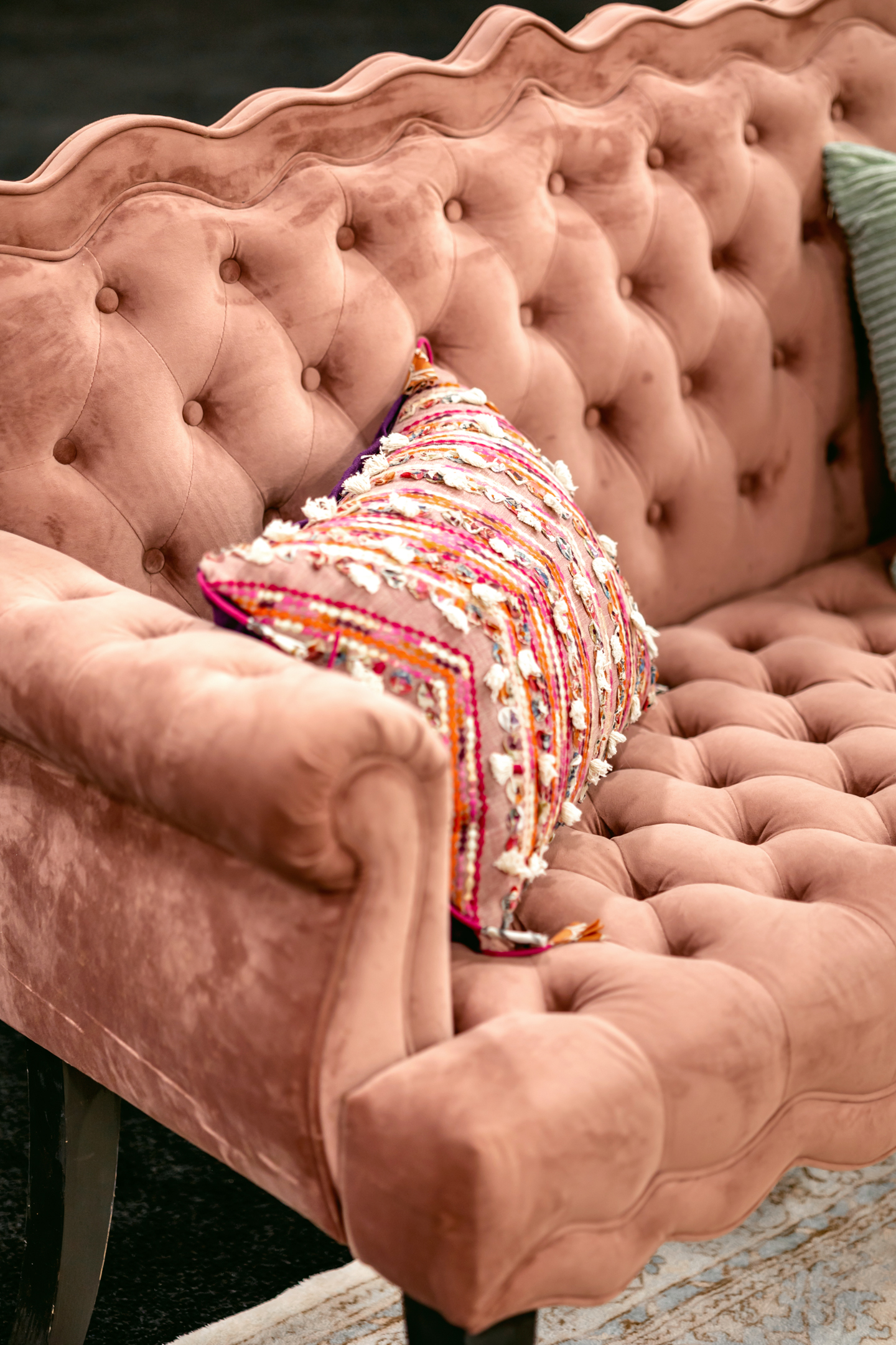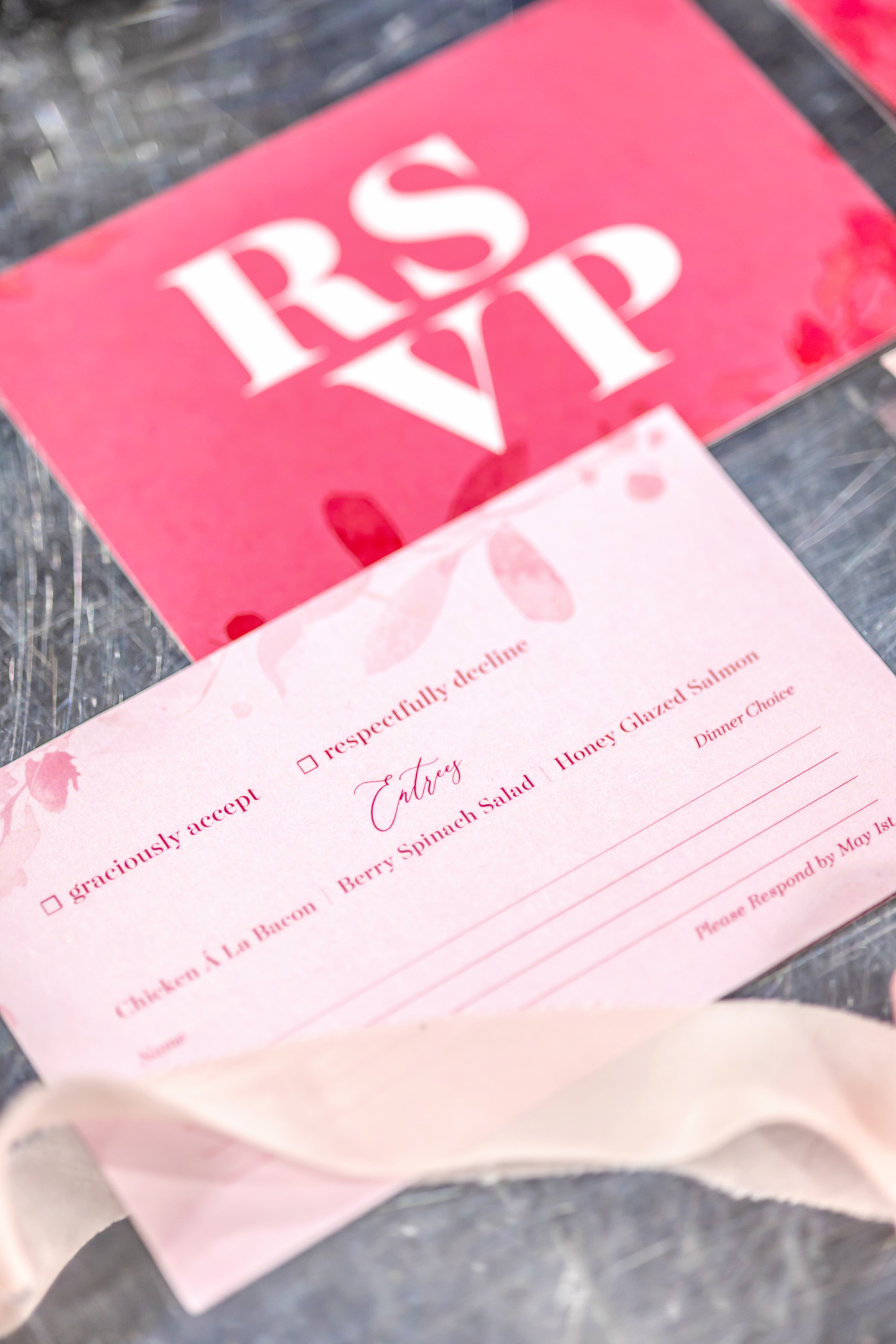 Coordinated Miriam Events Co., the bold, romantic, and chic “Pink Dreamscape” brought together vibrant hues, luxurious textures, and modern details for a stunning wedding design. Lush floral arrangements by B-Style Floral in red, pink, and white set the tone in every space. The lounge area featured velvet furniture from Velvet Rentals in shades of pink and peach, a vintage audio guest book, and playful hot pink suitcases.