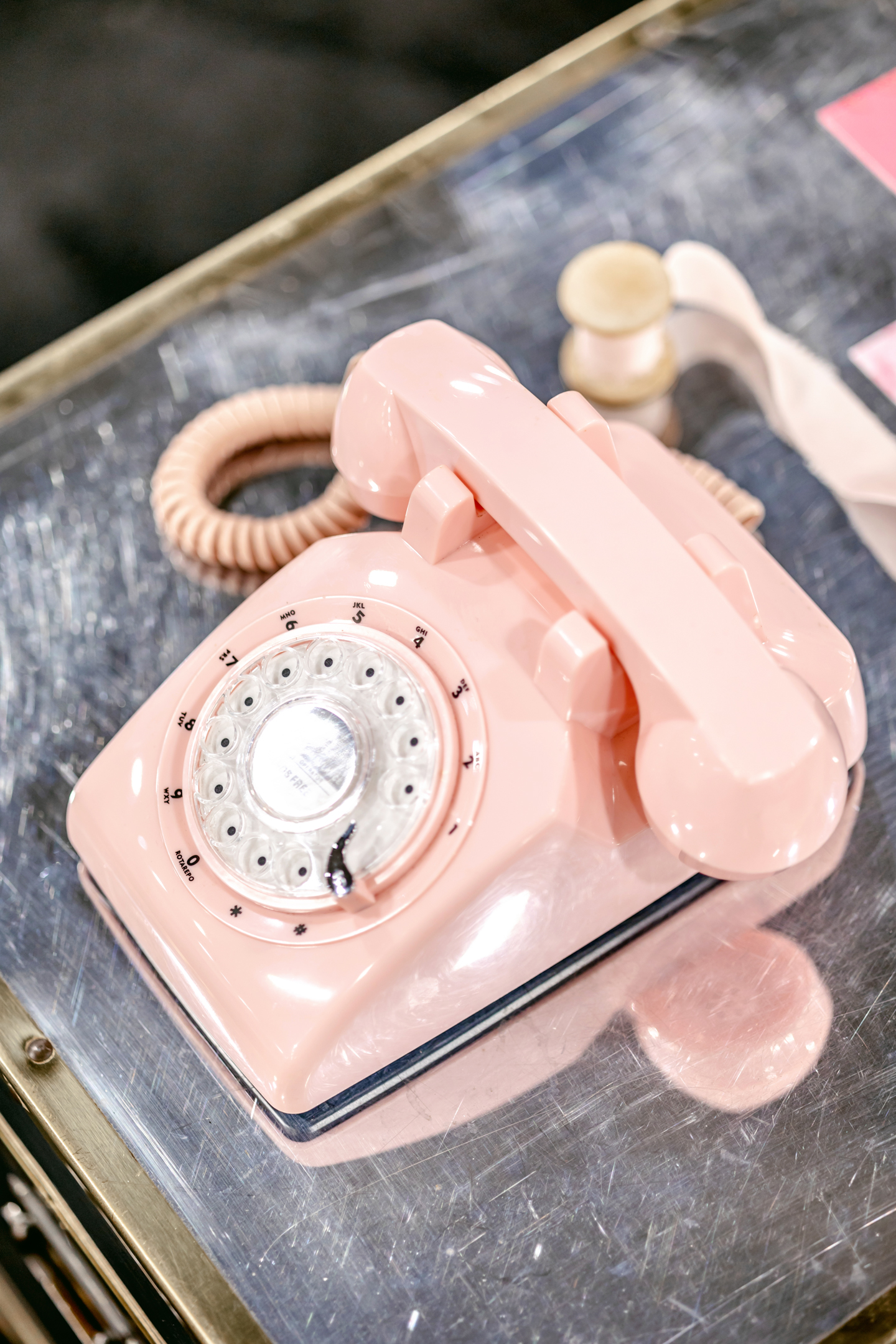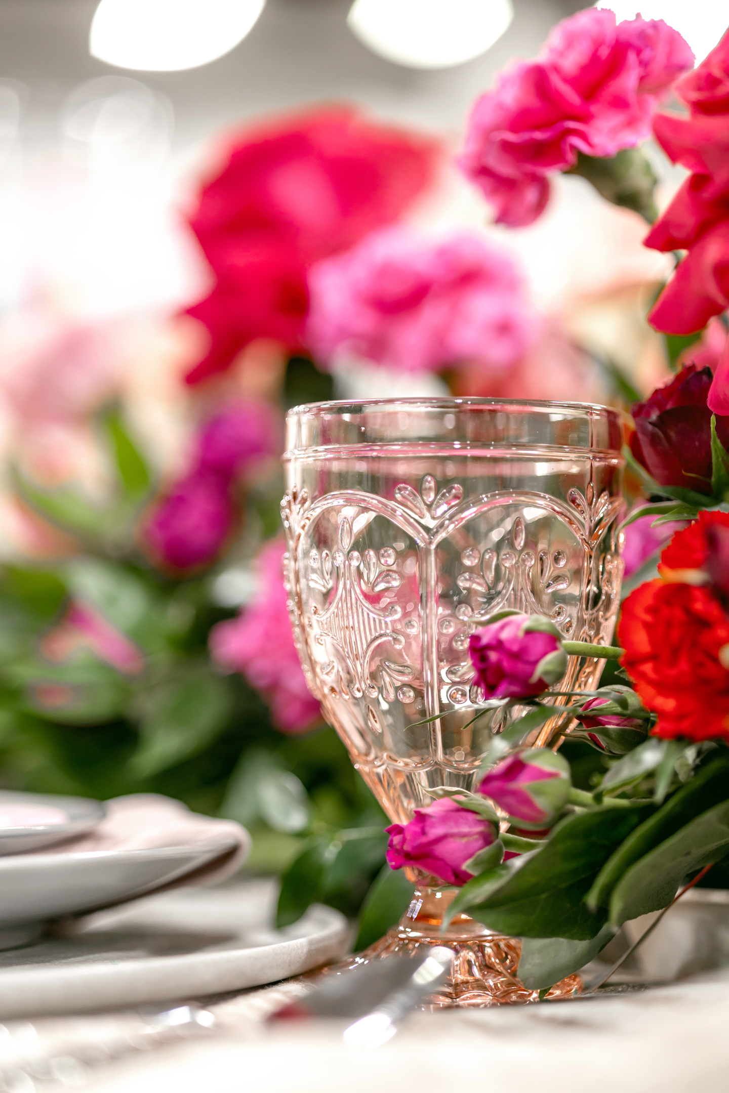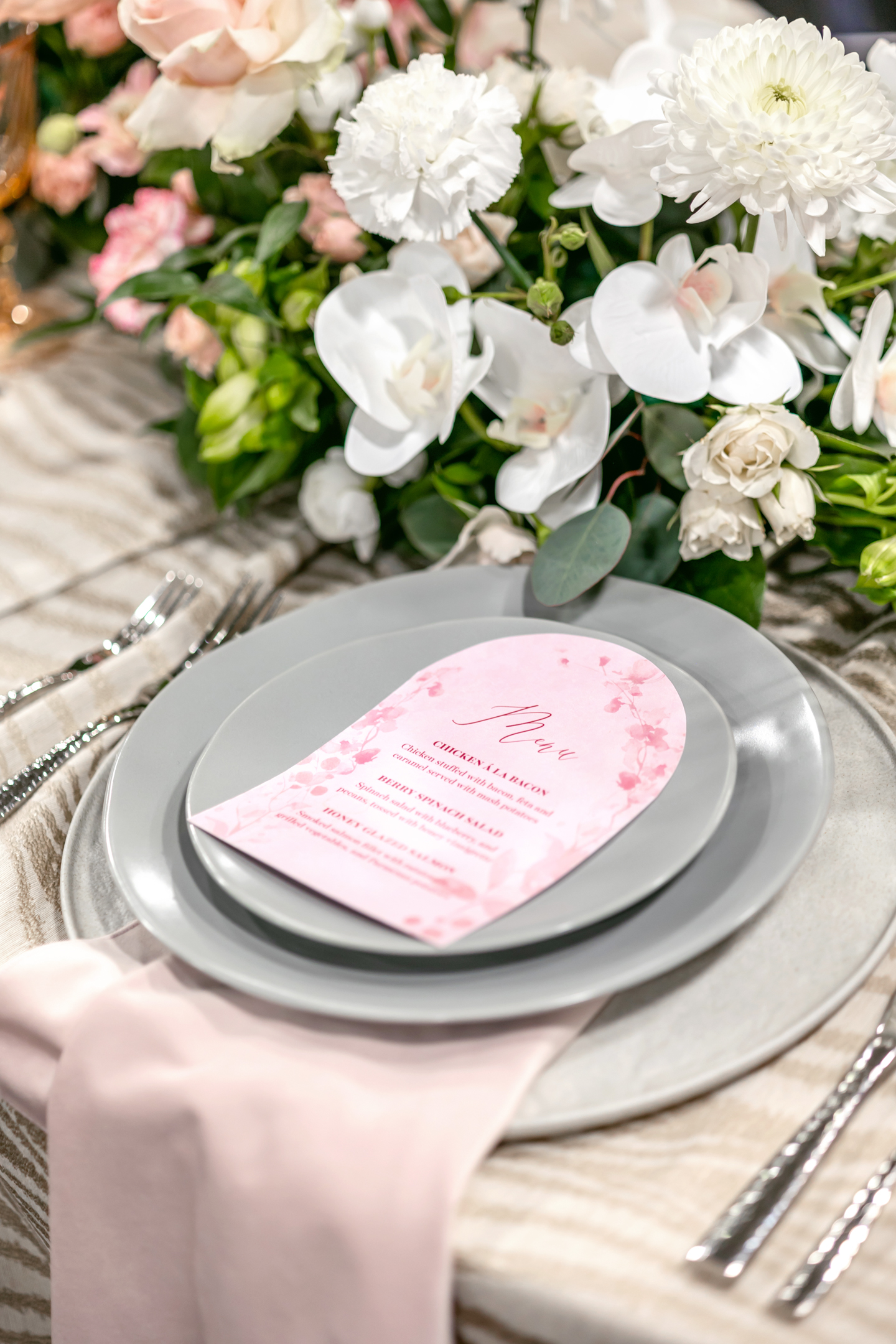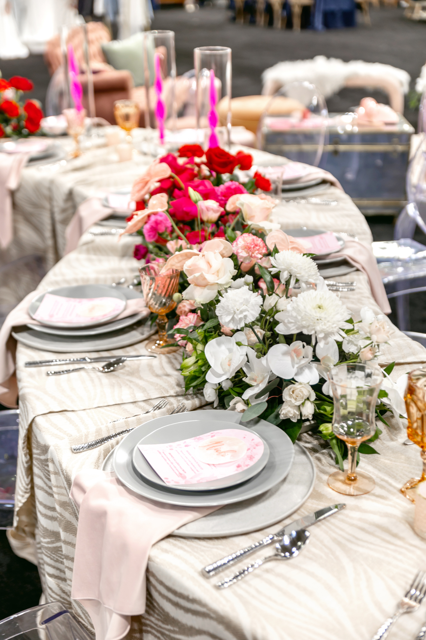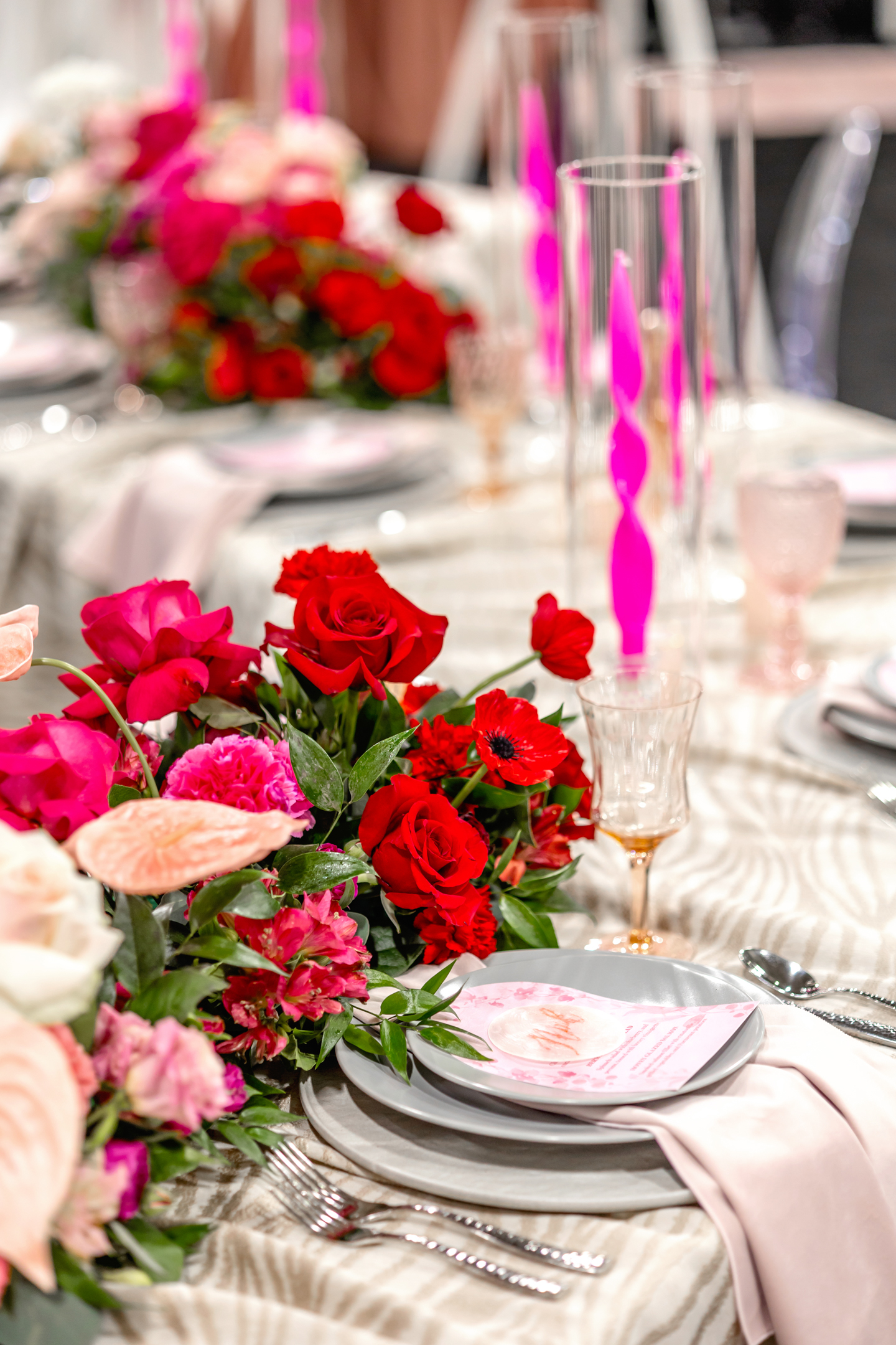 The reception showcased a long serpentine table decorated with an abstract Champagne Jacob tablecloth, silver flatware and plates, amber and pink glassware, and hot pink twist candles. Artistic, contour-cut menus and handwritten mother-of-pearl name cards sat atop silver plates with blush napkins draped between layers.