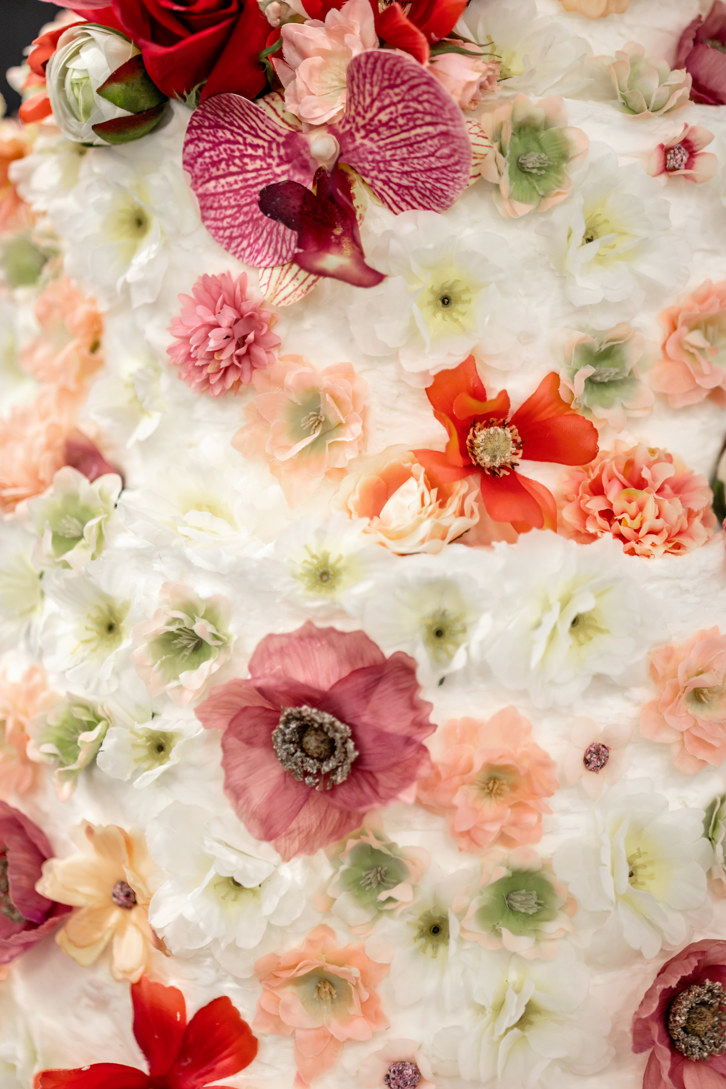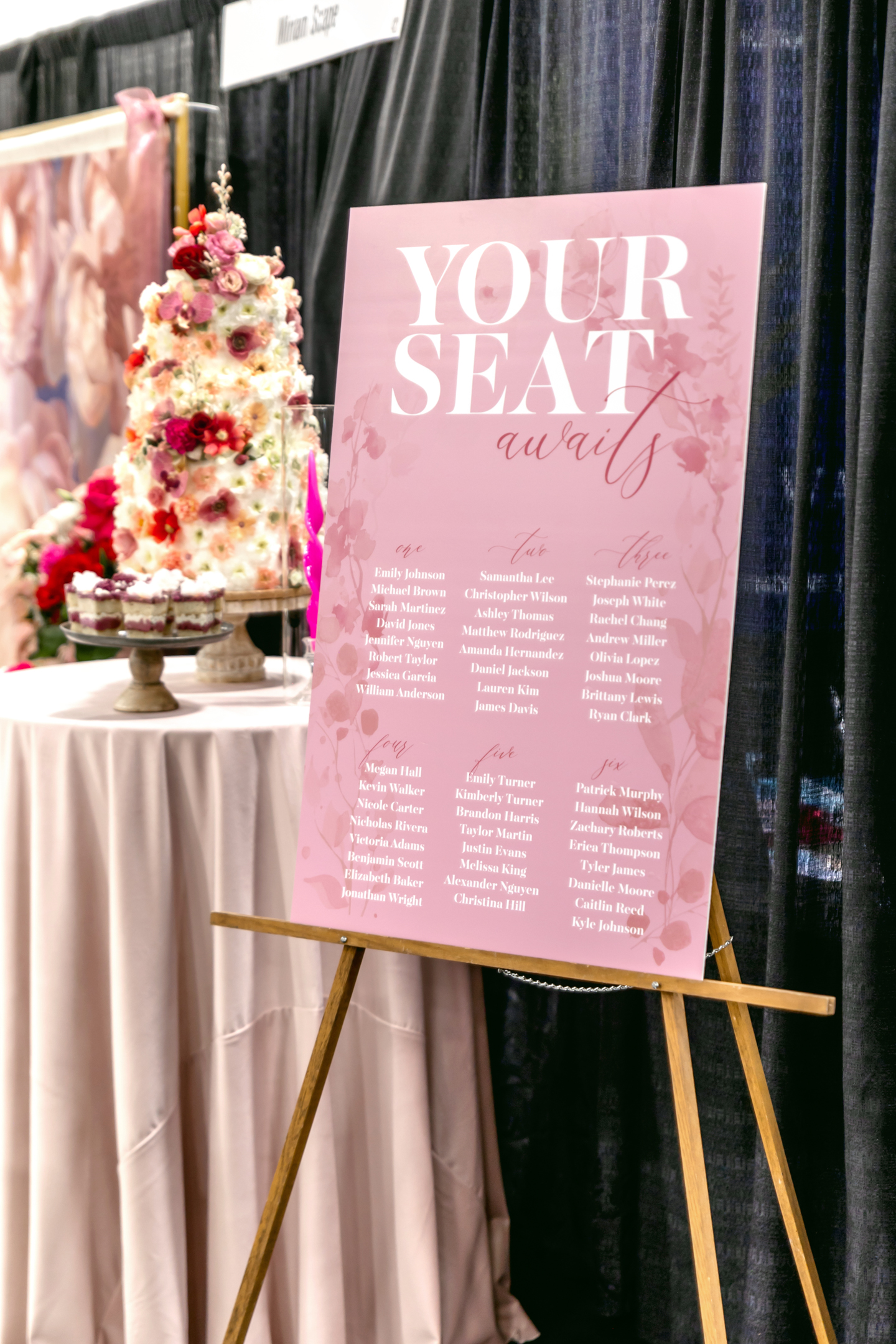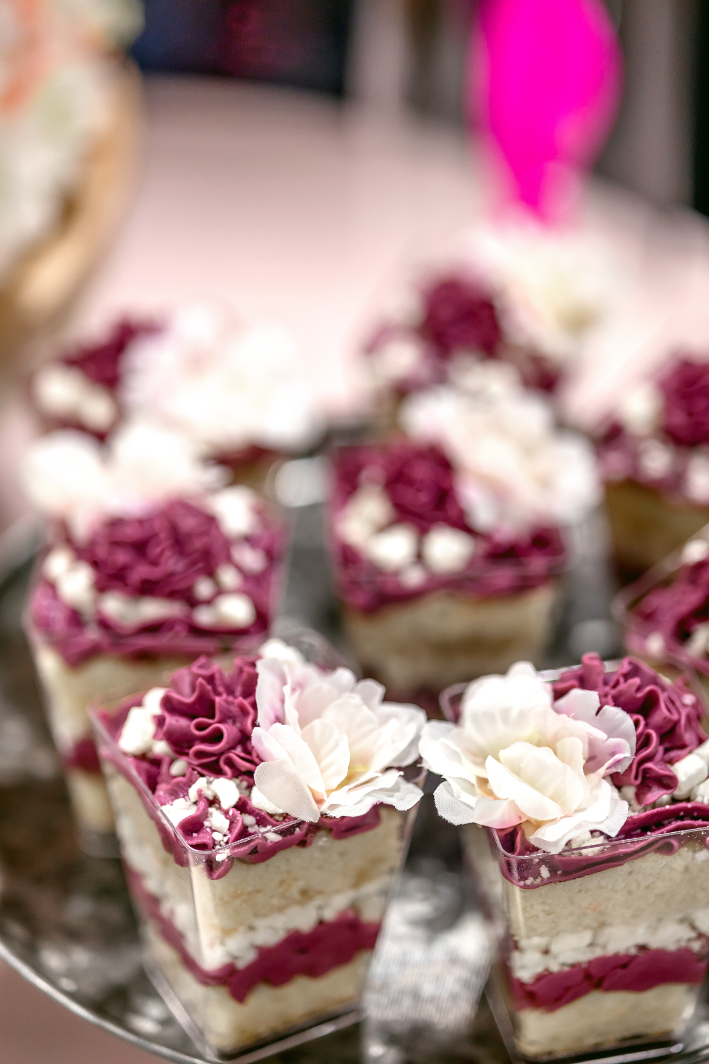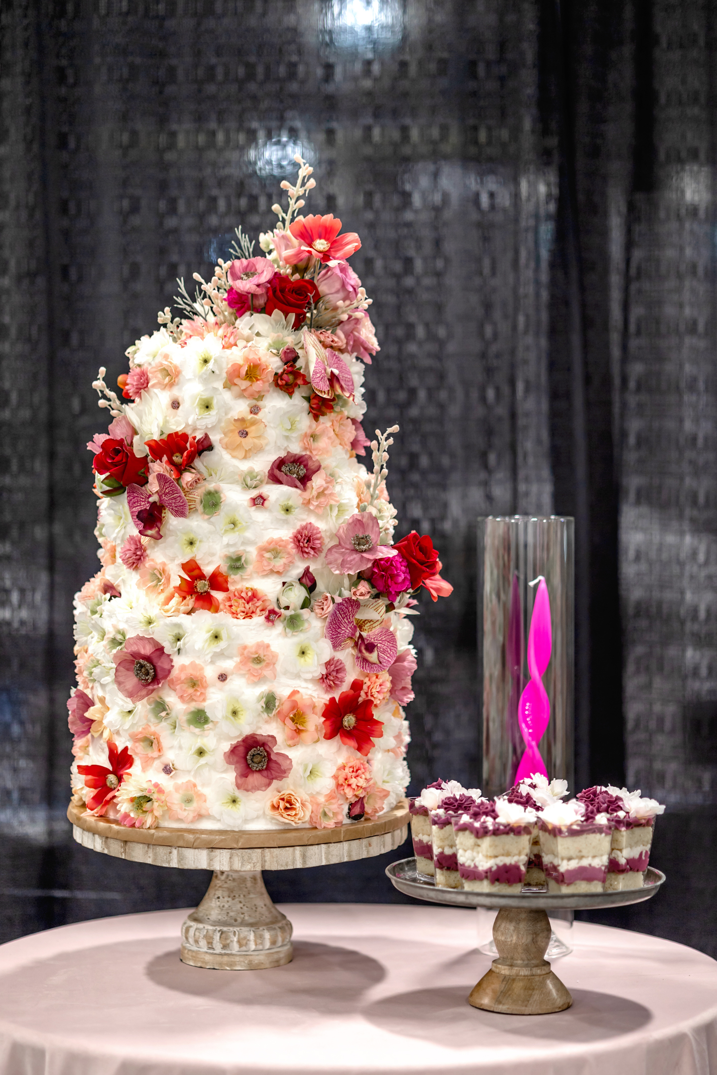 A textured, three-tiered cake by Cowboy David’s Bakery stunned at the dessert table, adorned top to bottom with bold blooms and petals. Complemented by layered EventCups™ with delicate frosting, the dessert display reflected the lush, colorful aesthetic of the entire scape.