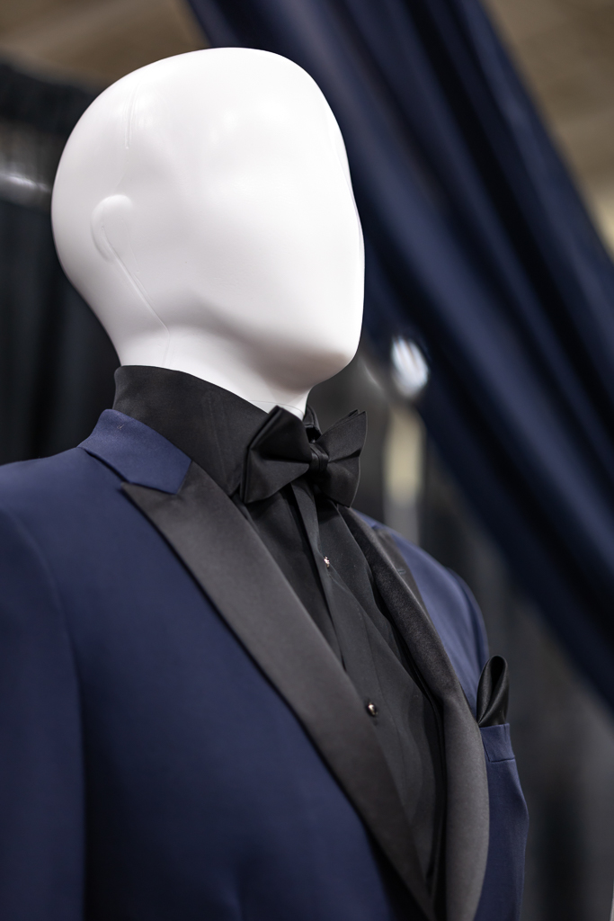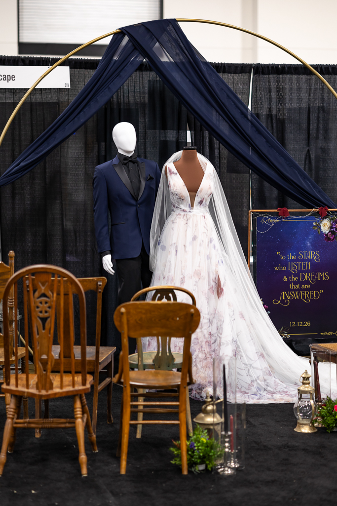 At the ceremony, the bride wore a light, ethereal gown from Bon Bon Belle with a plunging neckline, floral details, and a flowing tulle veil. The groom donned classic black attire and a navy tuxedo coat by DuBois Formalwear. A round arch draped in navy tulle, surrounded by lanterns and candles, provided the perfect backdrop for couples looking to include romantic, starlit, and fantastical elements to their perfect day.