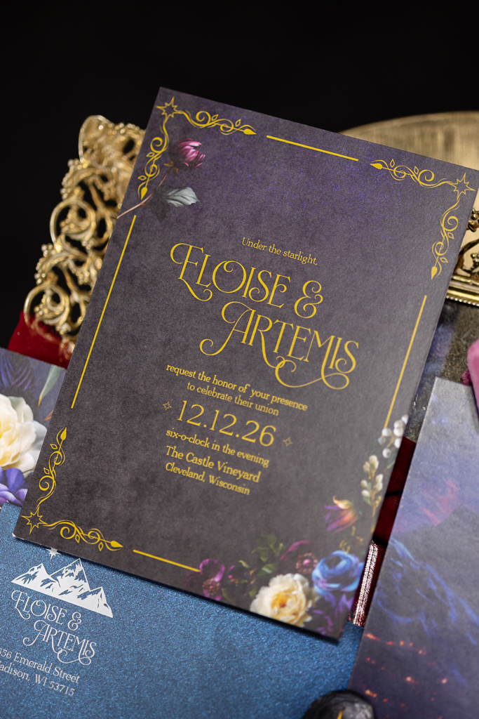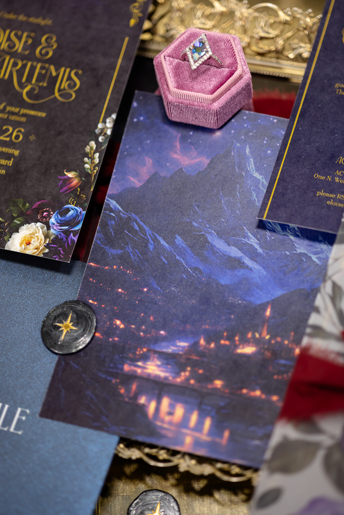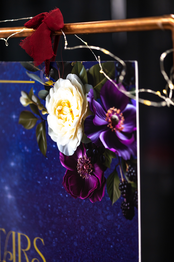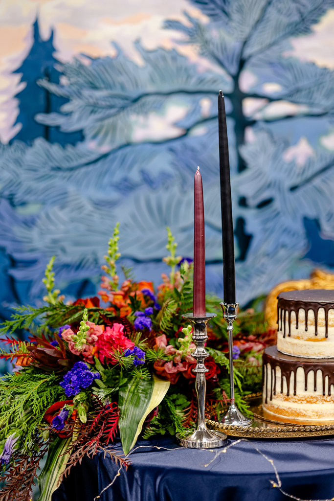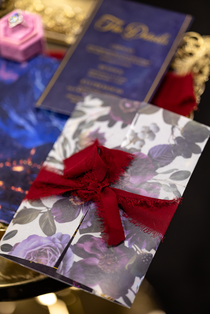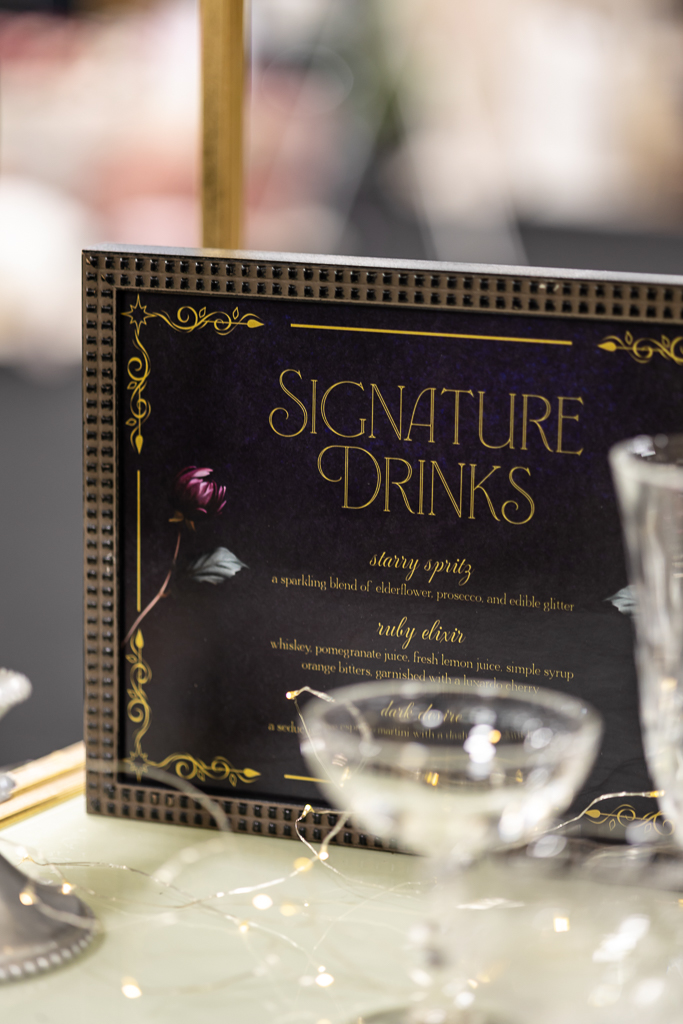 Brought to life by LK Bridal, this scape captured the magic of romance and fantasy with a rich color palette of navy blue, royal blue, burgundy, red, black, and accents of purple, cream, and gold. Stationery set the tone for the theme with a gold-framed invitation wrapped in floral vellum and tied with a burgundy bow, accompanied by a shimmering blue envelope, a snowy mountain cityscape illustration, and an RSVP card. LK Bridal also created a bar sign, welcome sign, and other printed elements throughout the scape.