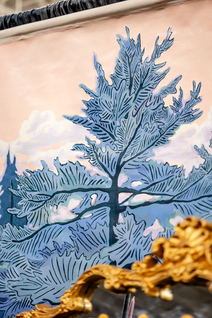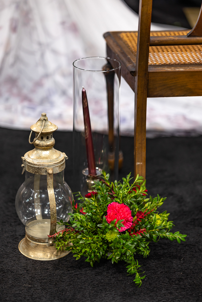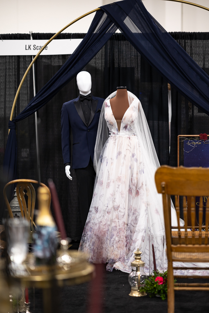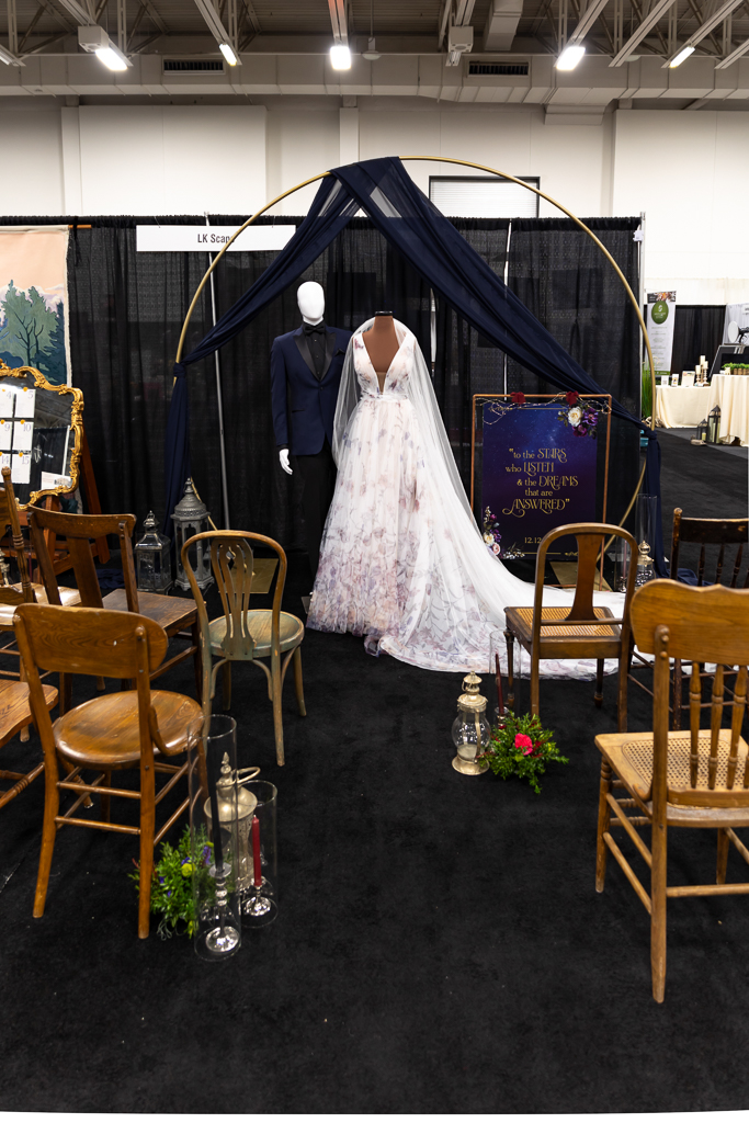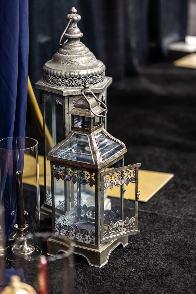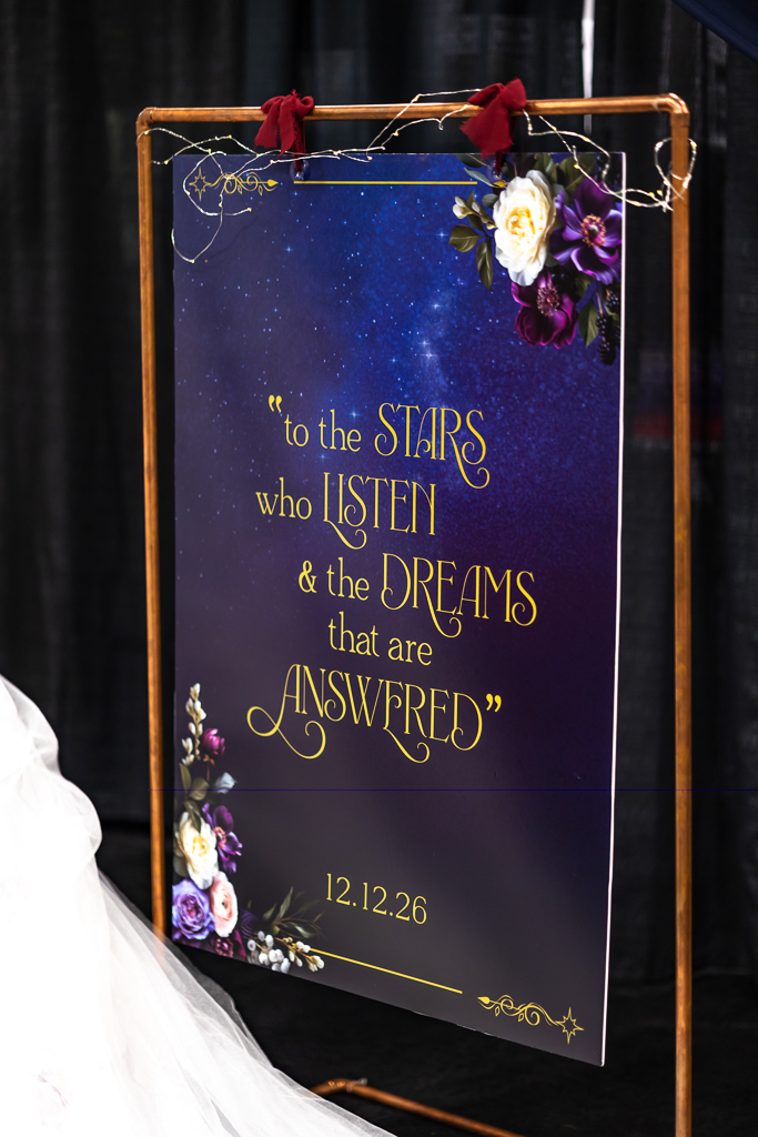 Brought to life by LK Bridal, this scape captured the magic of romance and fantasy with a rich color palette of navy blue, royal blue, burgundy, red, black, and accents of purple, cream, and gold. Stationery set the tone for the theme with a gold-framed invitation wrapped in floral vellum and tied with a burgundy bow, accompanied by a shimmering blue envelope, a snowy mountain cityscape illustration, and an RSVP card. LK Bridal also created a bar sign, welcome sign, and other printed elements throughout the scape.