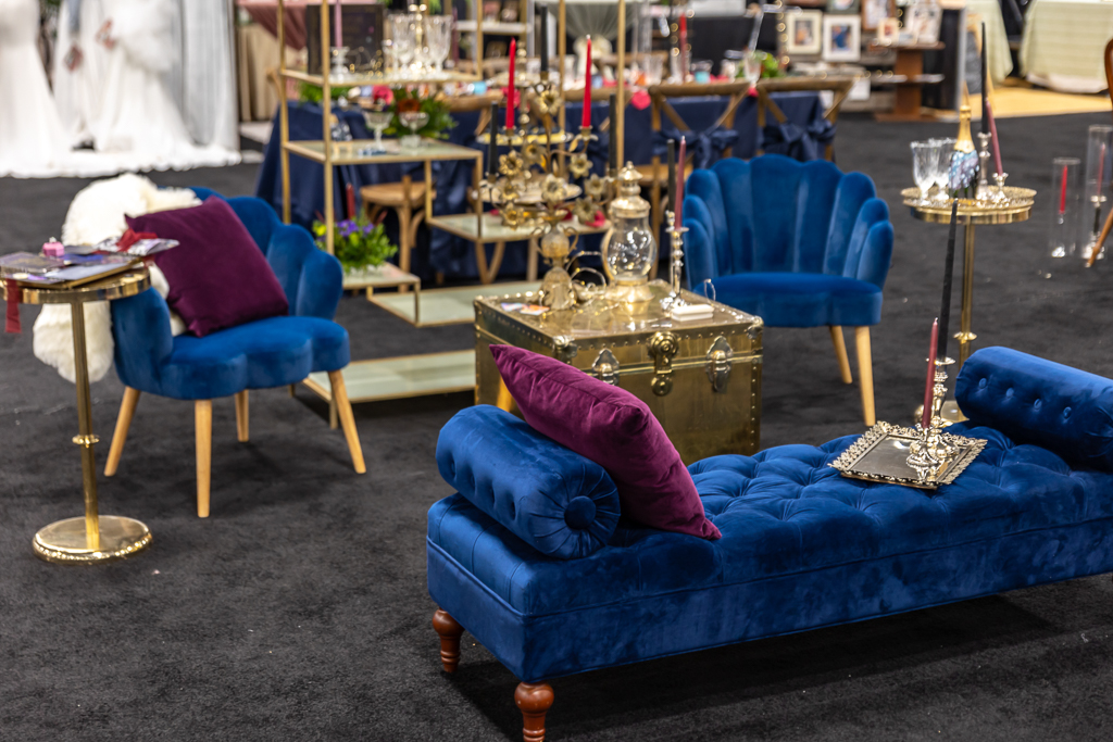 The lounge area featured plush blue velvet furniture from Velvet Rentals, accented by a gold abstract bookshelf, vintage candelabra, and crystal glassware. Velvet pillows, a reflective trunk as a table, and a hand-painted champagne bottle by Cayla the Painter completed the cozy atmosphere.