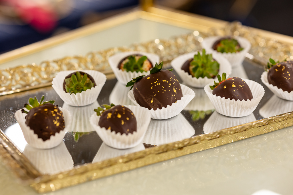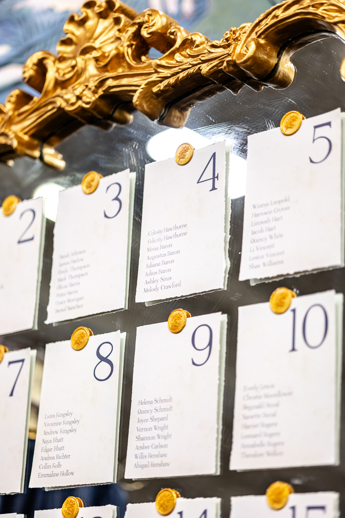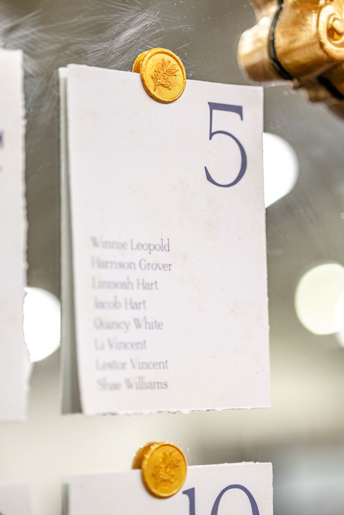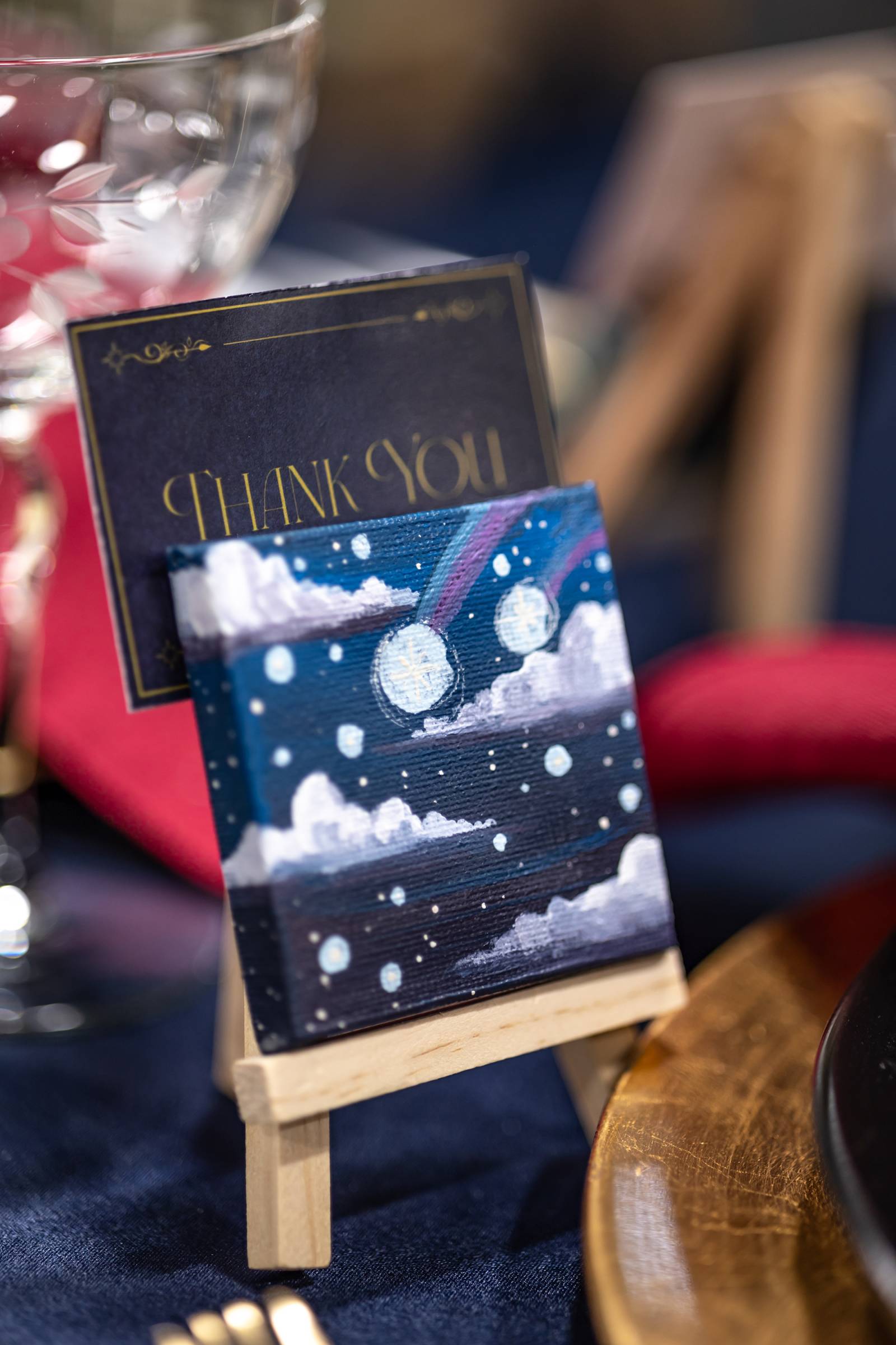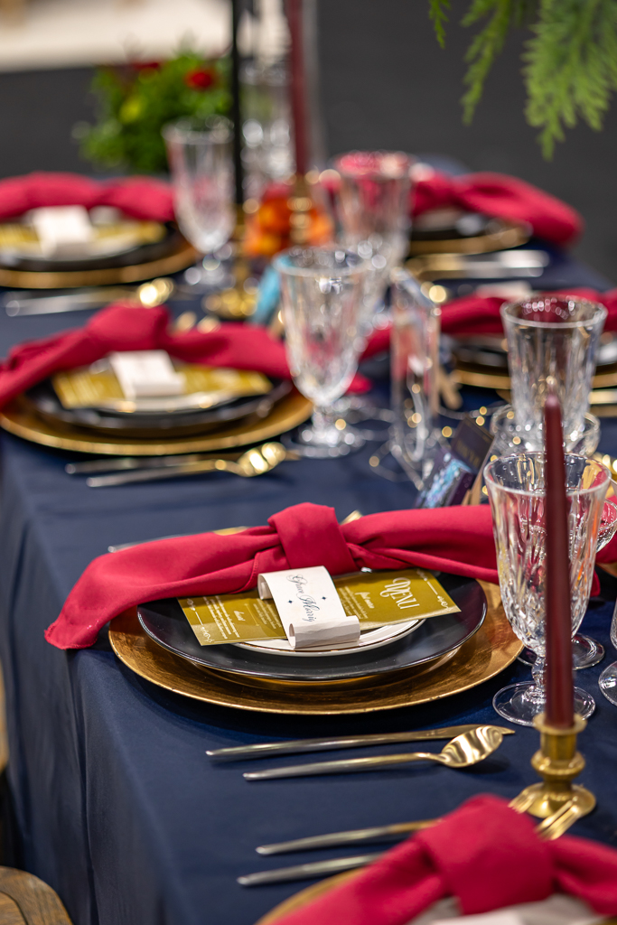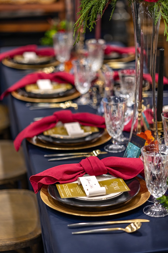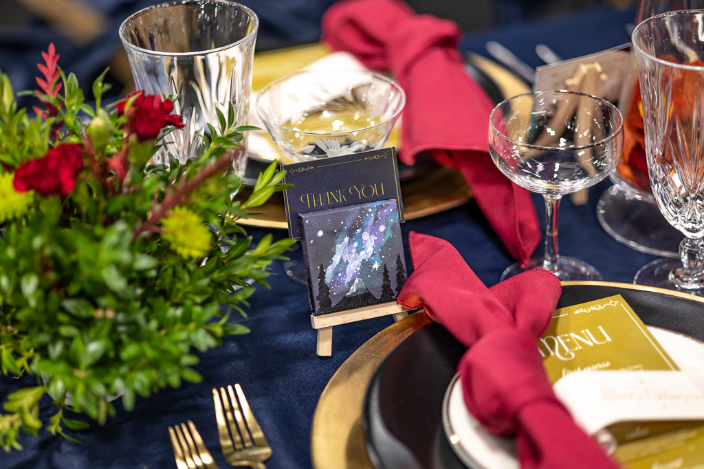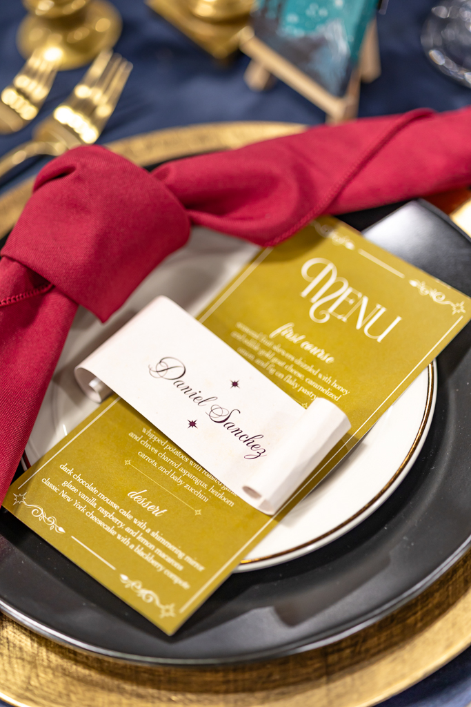 A mirror escort wall, with torn-edge table assignments and gold wax seals, was created to guide guests to their seats. At the tablescape, tall glass vases created a floating floral illusion, while navy satin linens, gold chargers, black plates, gold-rimmed bread plates, and burgundy knotted napkins from Event Essentials added sophistication. Each place setting also had a parchment-style name card, gold menu, and a hand-painted mini canvas guest favor by Cayla the Painter.