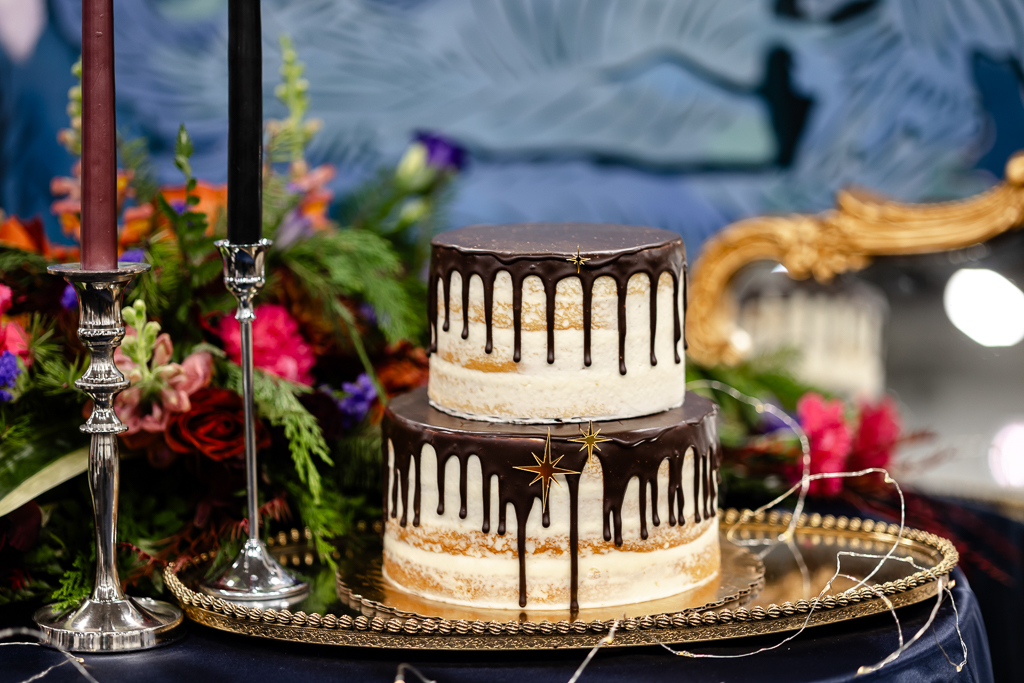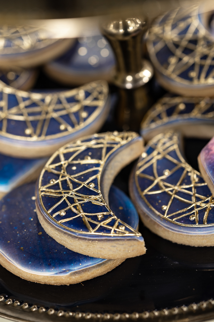 Desserts included a two-tier chocolate drip cake, celestial mini-cupcakes, and gold-dusted chocolate-covered strawberries by Sandy Kakes. Starry sugar cookies by Royally Sweet Cookies added even more magic to the celestial design. The dessert table shined in front of a hand-painted forest mural by Castle Walls Wedding.
