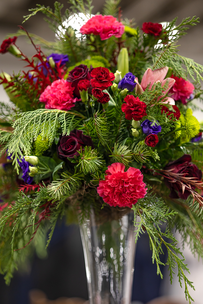 Hy-Vee designed floral arrangements in pinks, blues, and purples surrounded by lush greenery. A large statement floral piece graced the dessert table, while smaller arrangements added charm to the ceremony, tablescape, and lounge bookshelf.