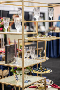 The lounge area featured plush blue velvet furniture from Velvet Rentals, accented by a gold abstract bookshelf, vintage candelabra, and crystal glassware. Velvet pillows, a reflective trunk as a table, and a hand-painted champagne bottle by Cayla the Painter completed the cozy atmosphere.