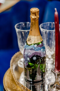 The lounge area featured plush blue velvet furniture from Velvet Rentals, accented by a gold abstract bookshelf, vintage candelabra, and crystal glassware. Velvet pillows, a reflective trunk as a table, and a hand-painted champagne bottle by Cayla the Painter completed the cozy atmosphere.