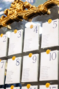 A mirror escort wall, with torn-edge table assignments and gold wax seals, was created to guide guests to their seats. At the tablescape, tall glass vases created a floating floral illusion, while navy satin linens, gold chargers, black plates, gold-rimmed bread plates, and burgundy knotted napkins from Event Essentials added sophistication. Each place setting also had a parchment-style name card, gold menu, and a hand-painted mini canvas guest favor by Cayla the Painter.