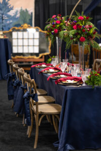 Brought to life by LK Bridal, this scape captured the magic of romance and fantasy with a rich color palette of navy blue, royal blue, burgundy, red, black, and accents of purple, cream, and gold. Stationery set the tone for the theme with a gold-framed invitation wrapped in floral vellum and tied with a burgundy bow, accompanied by a shimmering blue envelope, a snowy mountain cityscape illustration, and an RSVP card. LK Bridal also created a bar sign, welcome sign, and other printed elements throughout the scape.