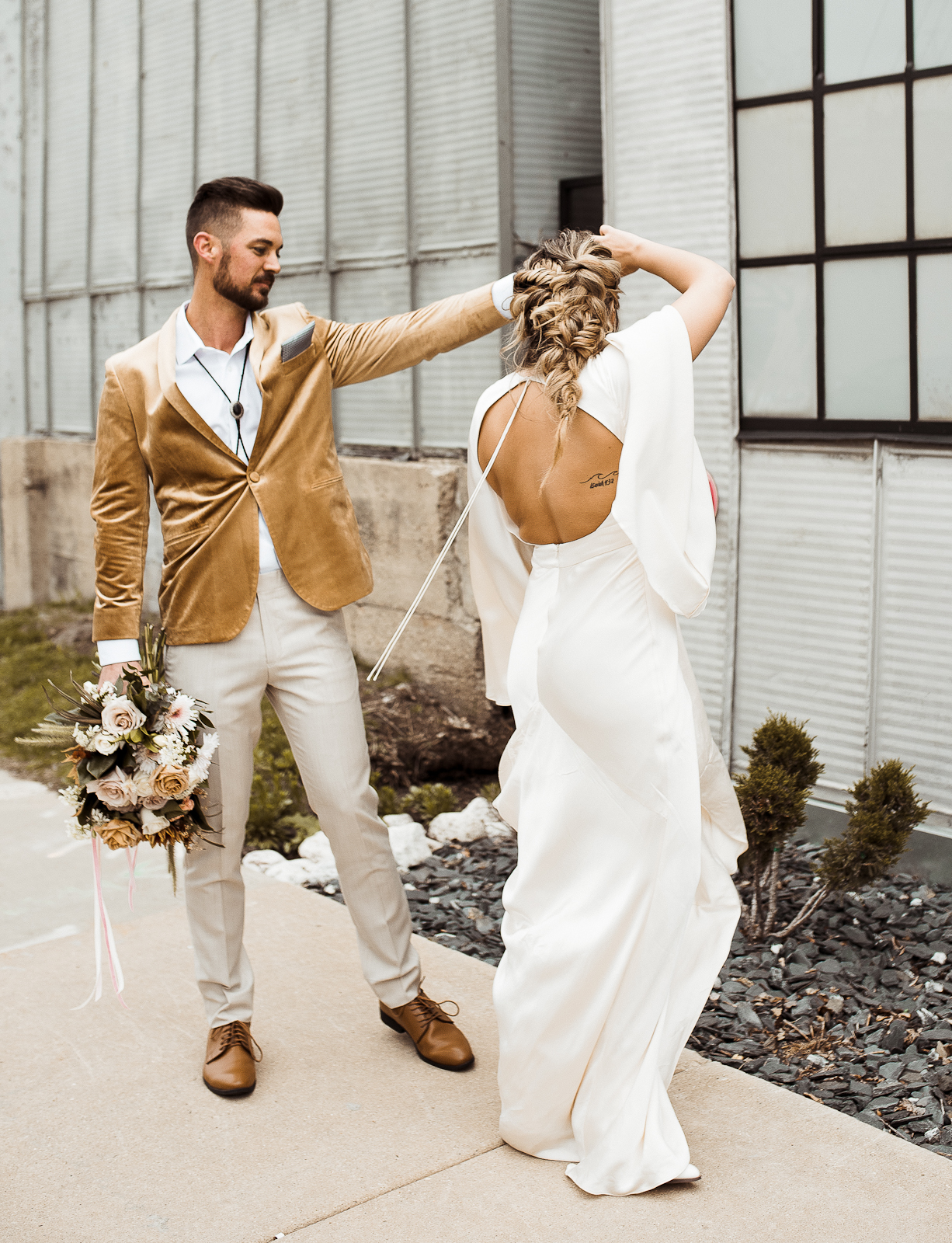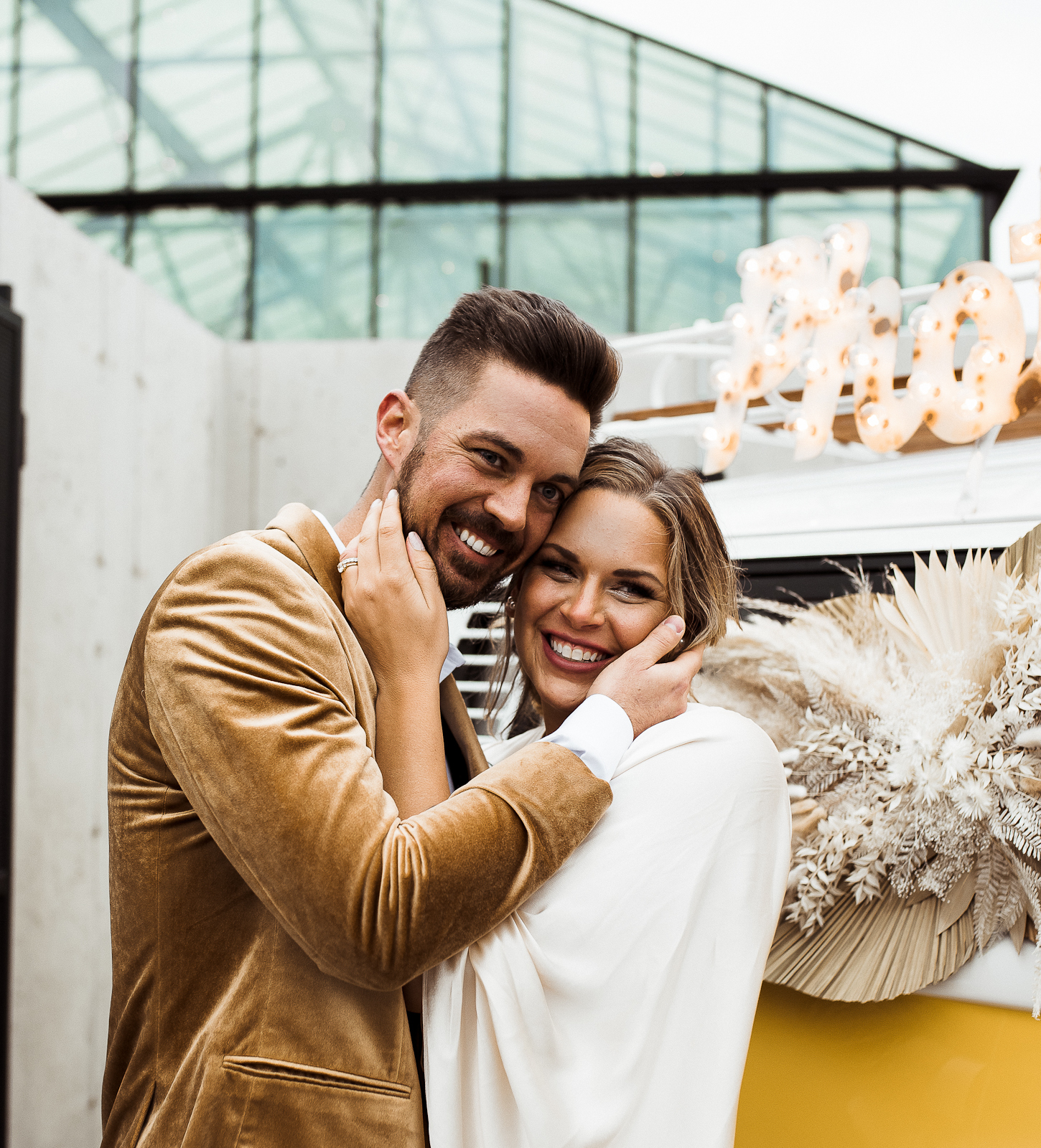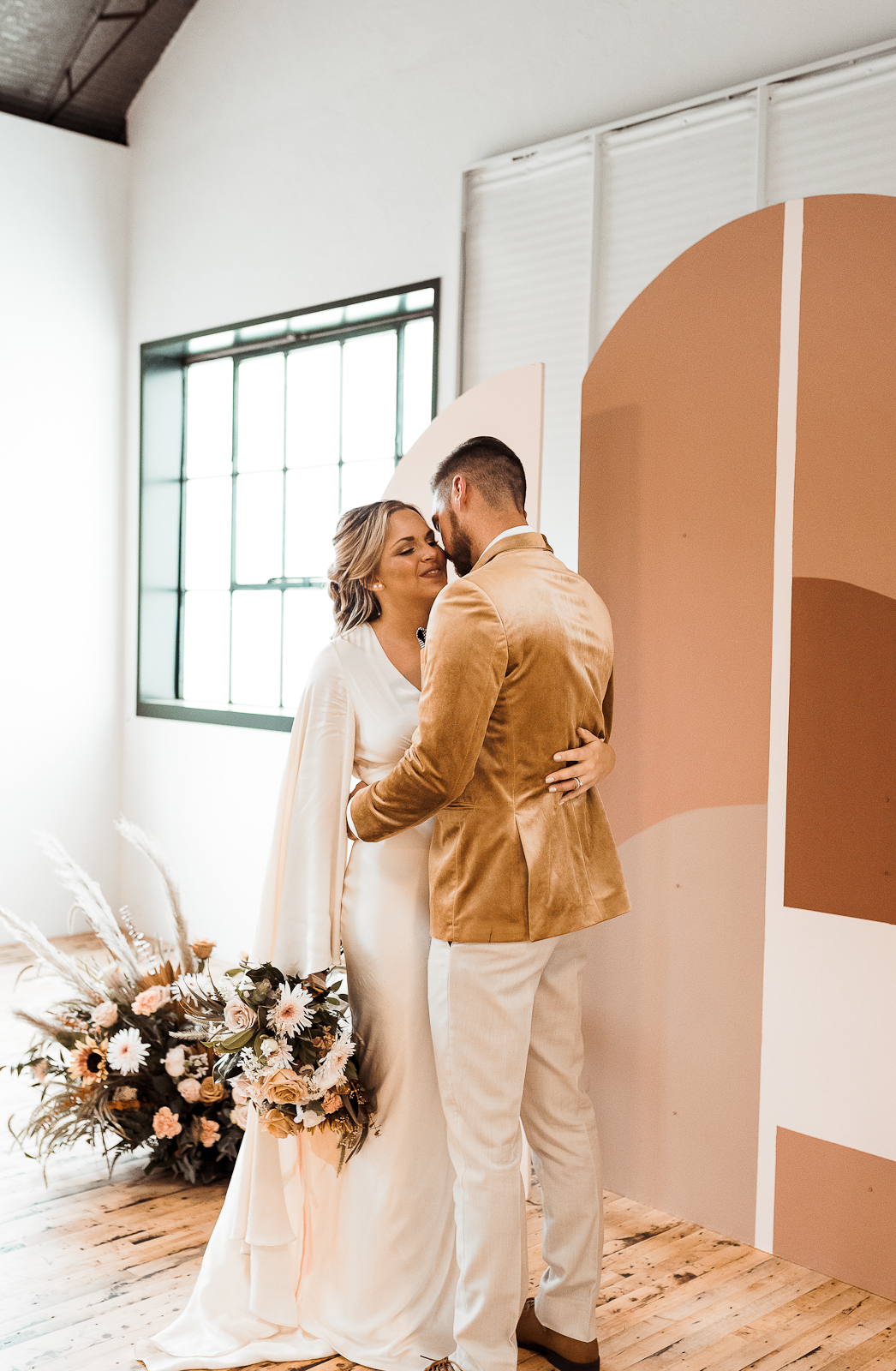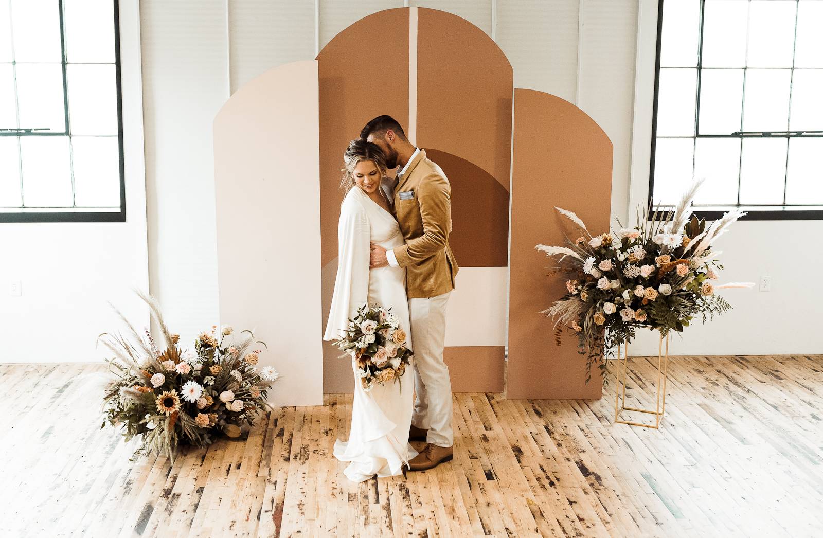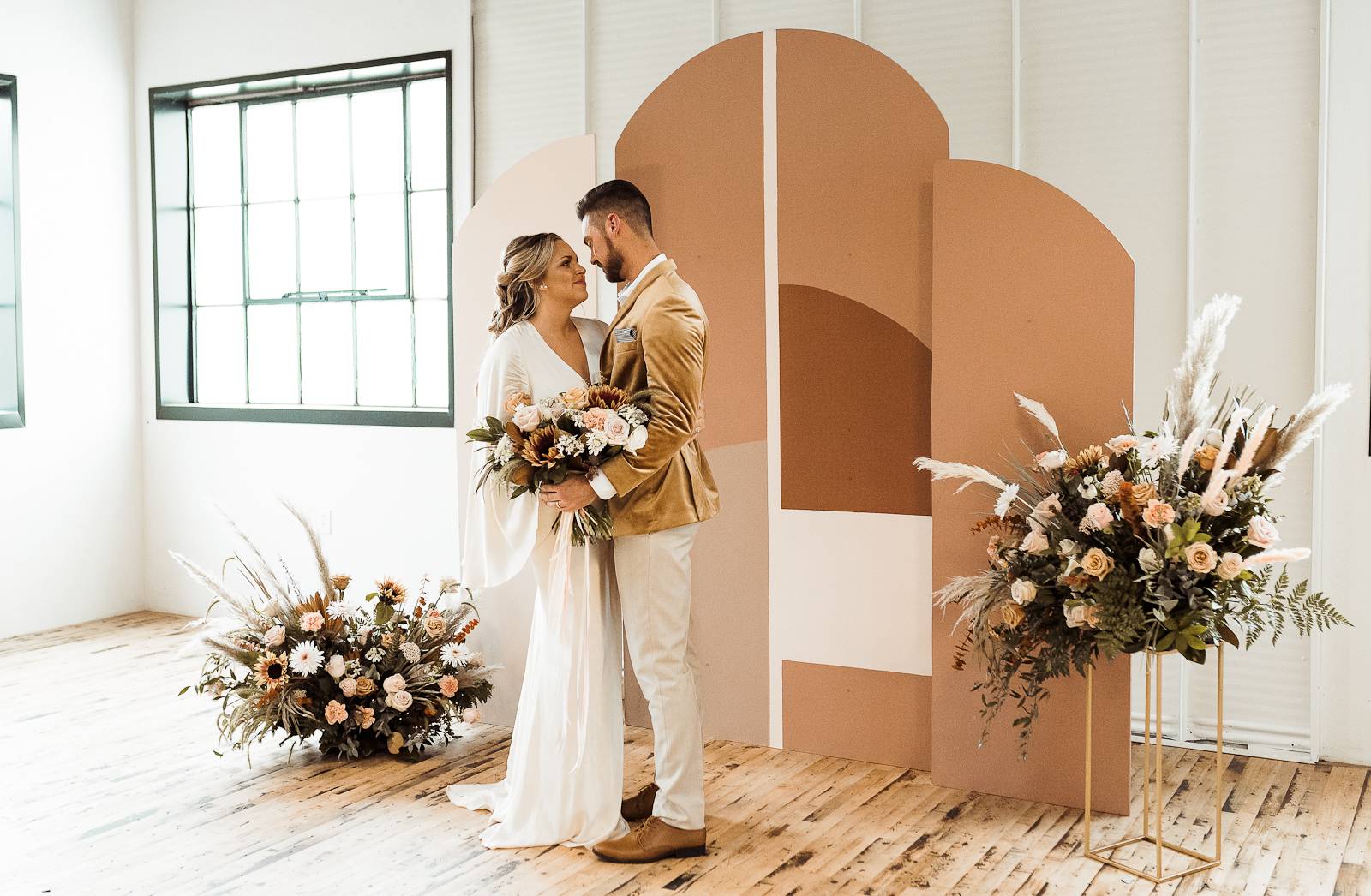 Is there anything sweeter than a warm golden summer sunset? We're loving every detail dripping in sunshine throughout this '70s-inspired modern boho styled shoot at The Tinsmith in downtown Madison! Bell sleeves, bolo ties, contemporary arches, lush blooms, moody vintage details, and the perfect retro photo booth to top of the chic wedding celebration – see it all below!