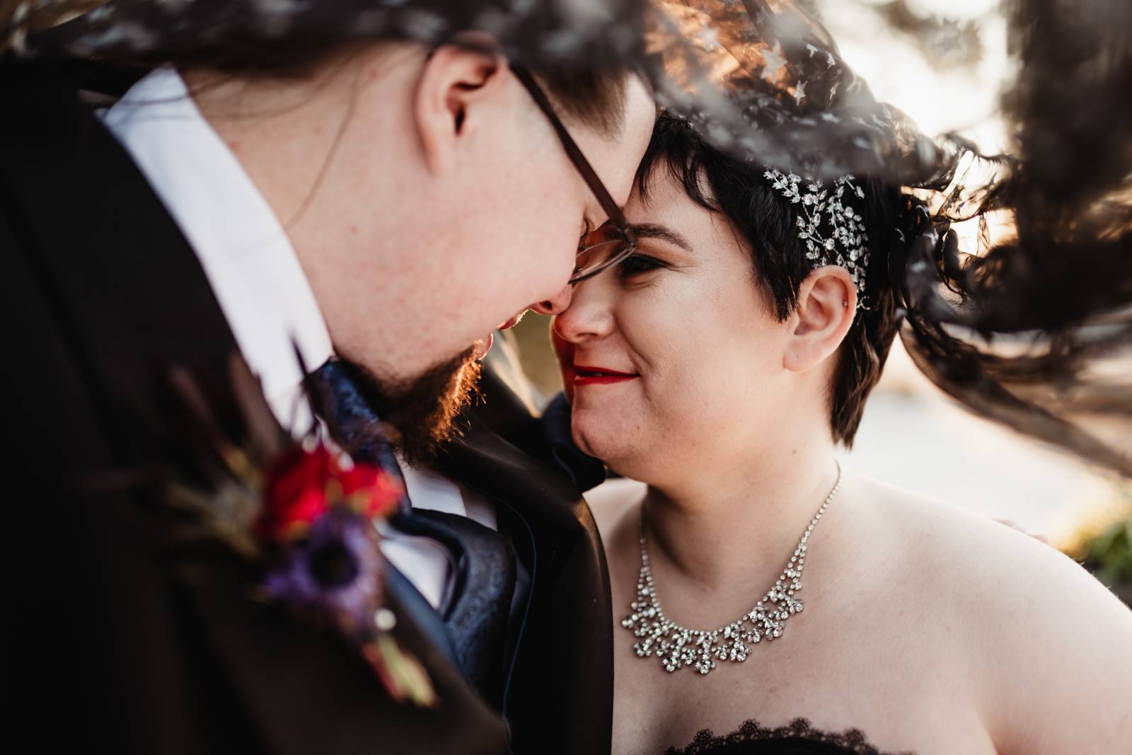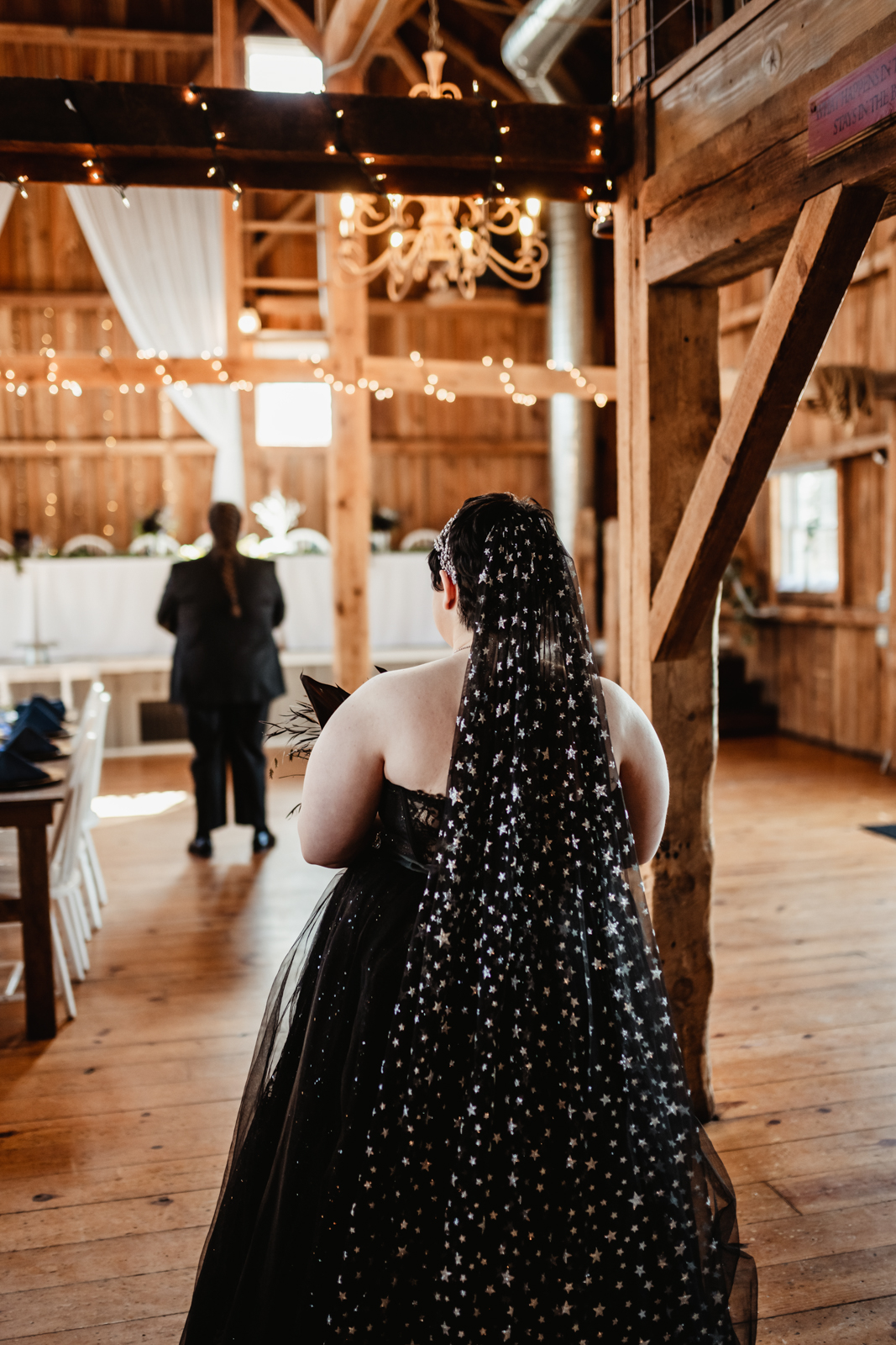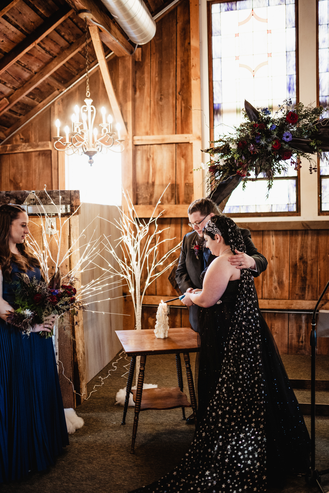 Sarah was stunning in her black gown and star-patterned veil, and she and Andrew tied the knot with identical rings. The couple celebrated their nuptials by dancing to the hauntingly beautiful, “Walking on the Air” – one of their favorite songs! With details like rich jewel-toned florals, an Aurora Borealis-inspired cake from Craig’s Cake Shop, and more, grab yourself your own cup of hot cocoa and enjoy all the inspiration below!