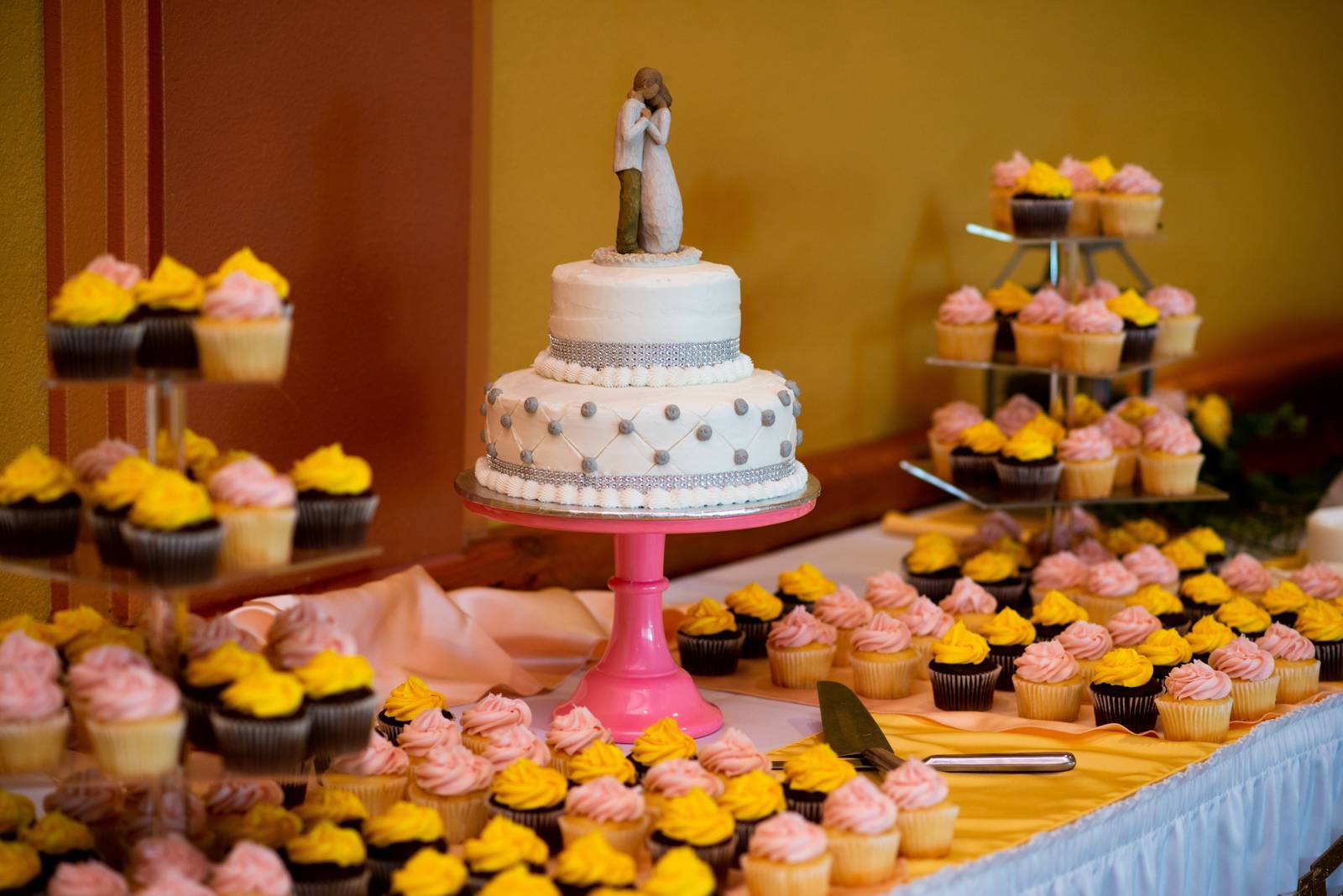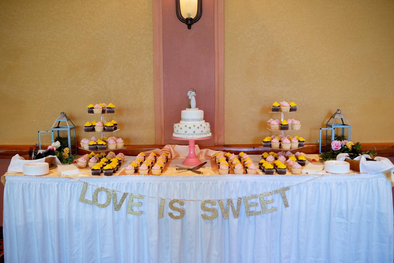 e used white linens from our vendor and had light pink and yellow linens as accent pieces.