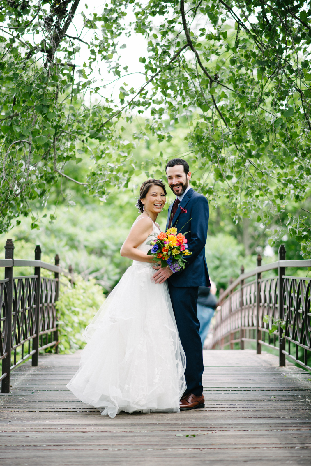 DESCRIBE YOUR WEDDING FLOWERS: With less than a week before the wedding, we went to the florist for a bouquet. I told her my life had been influenced by a colorful array of people and experiences, so I’d love to have a bright variety. She looked down at my rainbow shoelaces and said, “You do like color.” I picked up the bouquet on the morning of the wedding and was not disappointed!