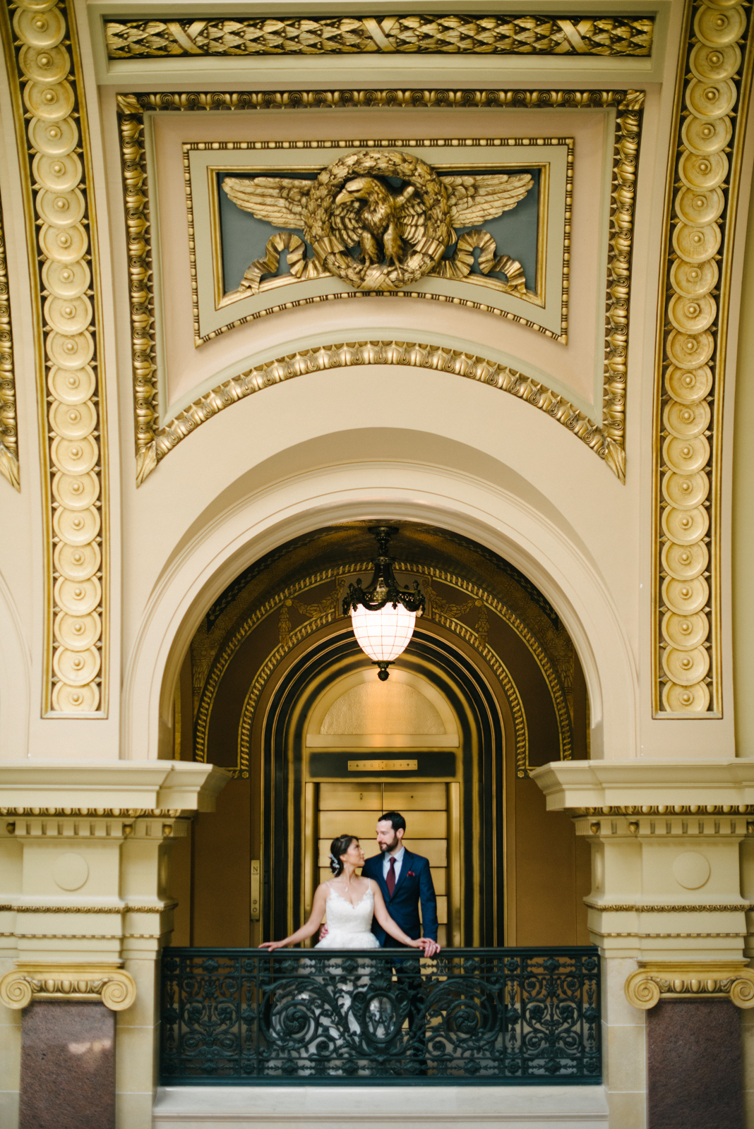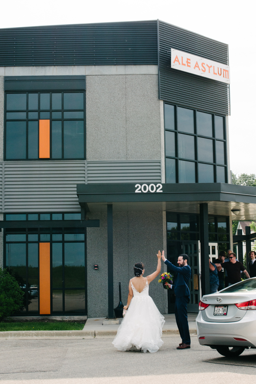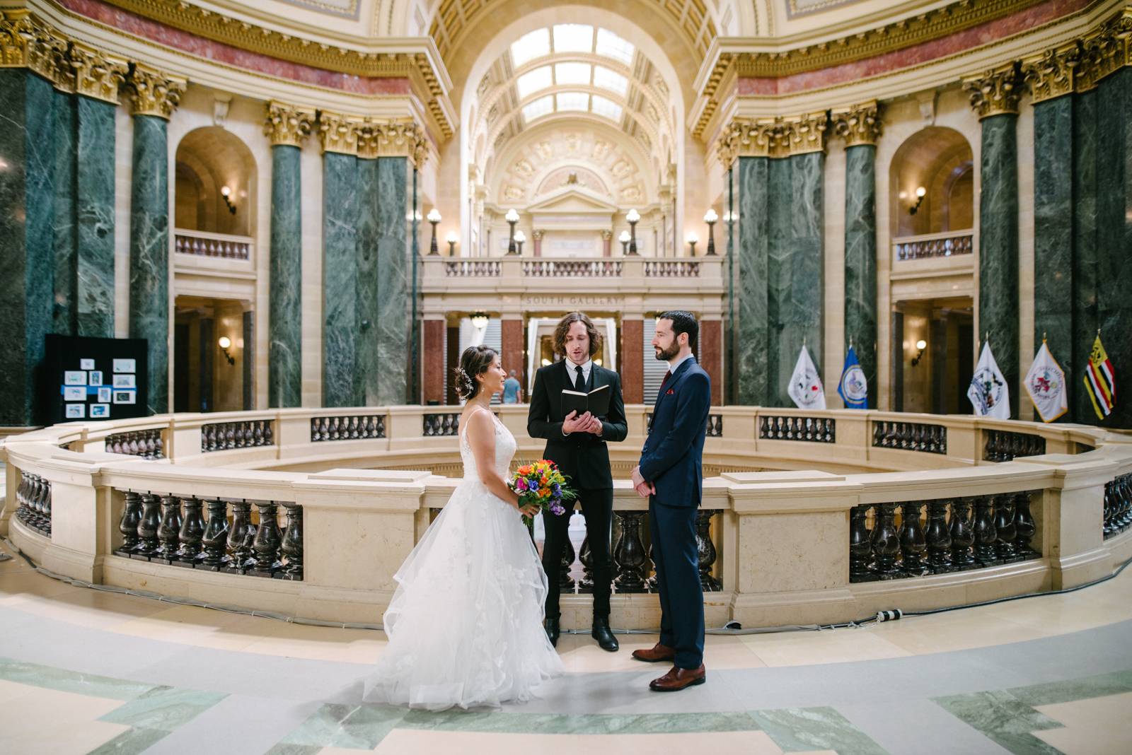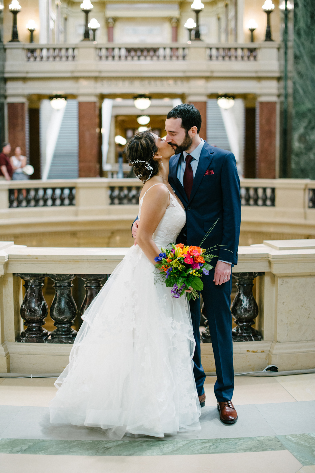 WHAT WAS YOUR INSPIRATION/DESIGN CONCEPT FOR YOUR CEREMONY AND RECEPTION? Our overall concept was to be ourselves and let our guests comfortably enjoy themselves. The ceremony was at the Wisconsin State Capitol on the second-floor rotunda. Of course, we didn’t decorate there, but that wasn’t even a thought in our minds. It’s a gorgeous space with stunning architecture. Most importantly, we wanted to focus on the experience, so the added sparkle was brought by our immediate families in attendance. We are beer lovers and wanted to have the reception at a brewery. After looking at several options, we decided on the Ale Asylum in Madison. We had been there many times before and always enjoyed the food, drinks, and service. We worked with their event coordinator, Angie, who reserved the second-floor and outdoor patio for us. We made a playlist of our favorite songs and a slideshow with photos spanning the 13 years of our relationship.